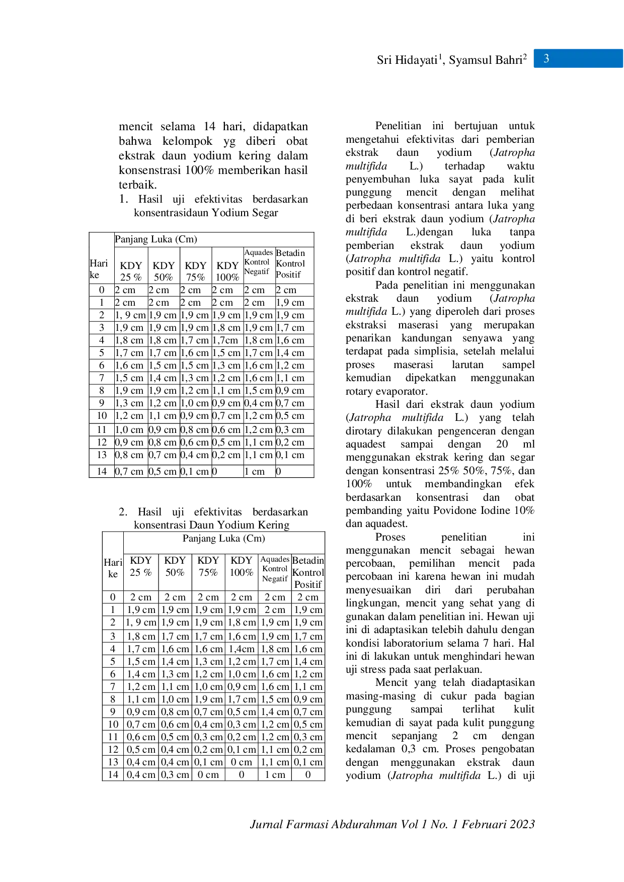 JURNAL FARMASI ABDURAHMANJURNAL FARMASI ABDURAHMANsalah satu tanaman yang bisa digunakan sebagai pengobatan tradisional adalah pohon yodium (jatropha multifida L), terdapat berbagai macam kegunaan pohon yodium (jatropha multifida L) dalam kehidupan sehari-hari diantaranya getah pada pohonnya bisa digunakan untuk mengobati luka baru dan bengkak dengan cara oleskan getah batang dan daun pada luka baru. Penelitian ini bertujuan untuk mengetahui efek pemberian ekstrak daun yodium (Jatropha multifida L.) Penelitian ini menggunakan metode eksperimental dengan menggunakan 26 ekor mencit sebagai hewan uji yang di bagi 4 kelompok yaitu 2 kelompok perlakuan ( ekstrak daun yodium segar konsentrasi 25%, 50%, 75%, 100% dan daun yodium kering konsentrasi 25%, 50%, 75%, 100%) dan 2 kelompok kontrol (kontrol positif menggunakan Povidon Iodine 10% dan kontrol negatif menggunakan aquadest). Semua mencit di lukai punggungnya sepanjang 2 cm dan kedalaman 0,3 cm. Luka diolesi dua kali sehari dengan ekstrak daun yodium segar, daun yodium kering, Povidon Iodine10% dan kontrol negatif aquadest. Pengamatan luka dilakukan setiap hari (hari ke 0 sampai ke 14). Hasil penelitian menunjukkan adanya perbedaan antara kelompok perlakuan (ekstrak daun yodium segar dan kering, konsentrasi 25%, 50%,75%, 100%) dan kelompok kontrol, dimana kelompok perlakuan ekstrak daun yodium kering lebih cepat menyembuhkan luka di bandingkan kelompok kontrol.