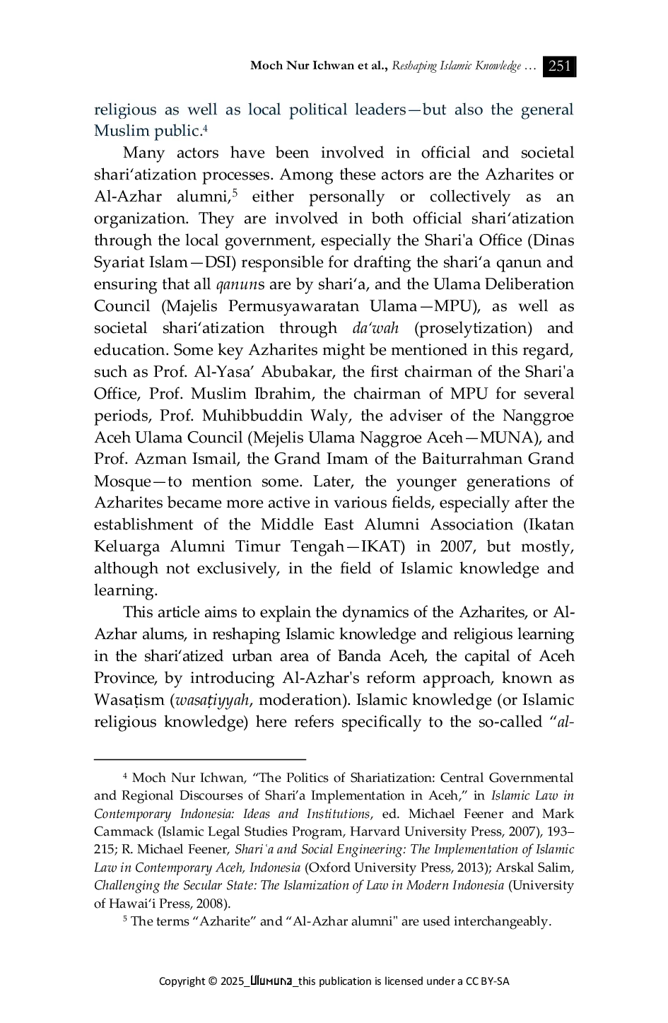 UlumunaUlumunaArtikel ini mengkaji peran signifikan Azharites (alumni Al‑Azhar) dalam transformasi pembelajaran agama perkotaan di Banda Aceh selama dua dekade terakhir. Penelitian menyoroti kontribusi mereka dalam penyebaran ilmu Islam melalui platform seperti Ikatan Alumni Timur Tengah (IKAT), komunitas membaca lanjutan, masjid, kedai kopi, serta media massa dan sosial. Mereka memfasilitasi pembelajaran publik ilmu Islam klasik, seperti tafsir, tahsin Al‑Quran, hadis, fiqh, usul fiqh, aqidah, sirah, dan mawarith, dengan memperkenalkan teks dasar, menengah, bahkan tingkat lanjutan. Selain itu, Azharites juga mempromosikan Wasatiyah (moderasi) dalam pemahaman Islam yang berakar pada tradisi Syafii‑Ashariyah, sambil mengintegrasikan teks dari mazhab lain seperti Hanafi, Hanbali, dan Maliki secara komparatif. Pendekatan mereka membedakan dari madhhabisme ketat maupun anti‑madhhabisme Salafi‑Wahhabisme dan radikalisme. Penelitian menyimpulkan bahwa Azharites berkontribusi pada demokratisasi diskursif dan reformasi yang menghasilkan reshaping pengetahuan Islam di Banda Aceh—dan provinsi Aceh secara umum—serta moderasi madhhabisme melalui pengenalan Wasatiyah dan pembentukan pembelajaran agama perkotaan alternatif.