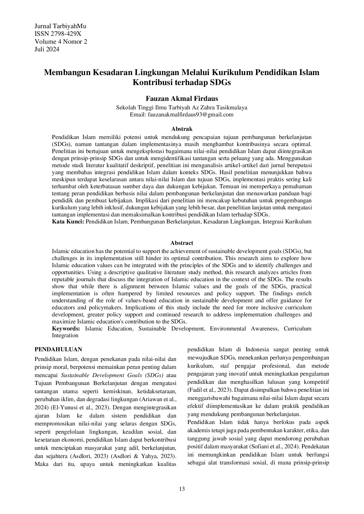 TarbiyahMUTarbiyahMUPendidikan Islam memiliki potensi untuk mendukung pencapaian tujuan pembangunan berkelanjutan (SDGs), namun tantangan dalam implementasinya masih menghambat kontribusinya secara optimal. Penelitian ini bertujuan untuk mengeksplorasi bagaimana nilai-nilai pendidikan Islam dapat diintegrasikan dengan prinsip-prinsip SDGs dan untuk mengidentifikasi tantangan serta peluang yang ada. Menggunakan metode studi literatur kualitatif deskriptif, penelitian ini menganalisis artikel-artikel dari jurnal bereputasi yang membahas integrasi pendidikan Islam dalam konteks SDGs. Hasil penelitian menunjukkan bahwa meskipun terdapat keselarasan antara nilai-nilai Islam dan tujuan SDGs, implementasi praktis sering kali terhambat oleh keterbatasan sumber daya dan dukungan kebijakan. Temuan ini memperkaya pemahaman tentang peran pendidikan berbasis nilai dalam pembangunan berkelanjutan dan menawarkan panduan bagi pendidik dan pembuat kebijakan. Implikasi dari penelitian ini mencakup kebutuhan untuk pengembangan kurikulum yang lebih inklusif, dukungan kebijakan yang lebih besar, dan penelitian lanjutan untuk mengatasi tantangan implementasi dan memaksimalkan kontribusi pendidikan Islam terhadap SDGs.