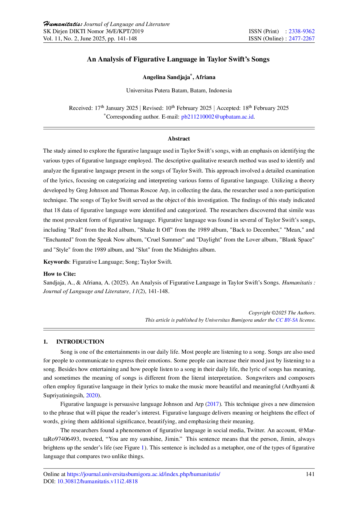 Humanitatis : Journal of Language and LiteratureHumanitatis : Journal of Language and LiteraturePenelitian ini bertujuan untuk menganalisis bahasa figuratif yang digunakan dalam lagu Taylor Swift, dengan fokus pada identifikasi berbagai jenis bahasa figuratif yang digunakan. Metode penelitian kualitatif deskriptif digunakan untuk mengidentifikasi dan menganalisis bahasa figuratif dalam lirik lagu Taylor Swift.