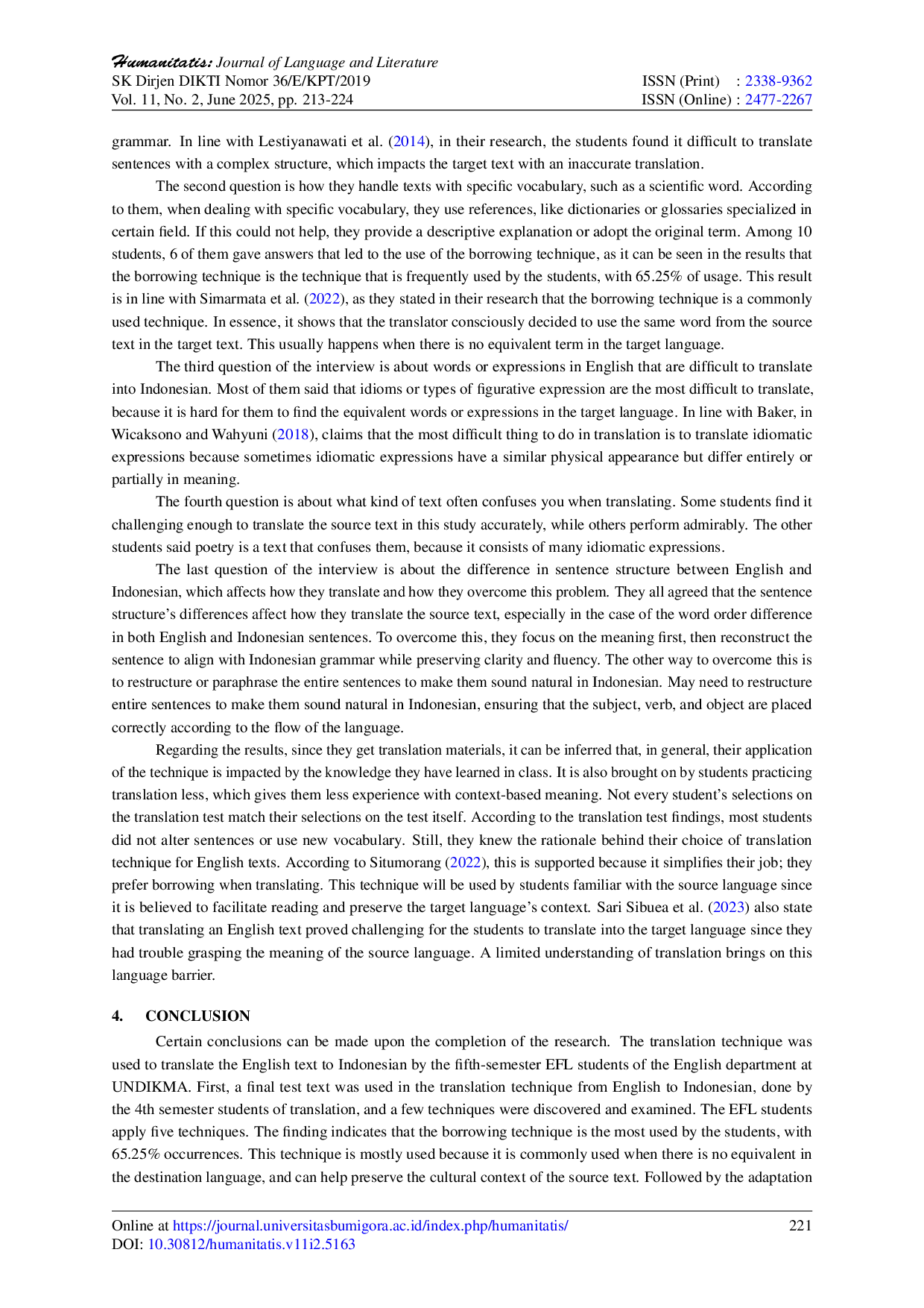 Humanitatis : Journal of Language and LiteratureHumanitatis : Journal of Language and LiteratureKarena perbedaan antara bahasa sumber dan bahasa sasaran, sejumlah teknik diterapkan selama proses penerjemahan untuk memastikan kesetaraan hasil terjemahan. Penelitian ini bertujuan menganalisis teknik penerjemahan yang diusulkan oleh Molina dan Albir yang digunakan oleh mahasiswa semester lima program Bahasa Inggris Sebagai Bahasa Asing (EFL) Departemen Bahasa Inggris Universitas Pendidikan Mandalika dalam menerjemahkan teks bahasa Inggris ke dalam bahasa Indonesia. Penelitian ini juga menunjukkan bahwa mahasiswa mengalami masalah dalam penerjemahan. Metode yang digunakan adalah penelitian kualitatif deskriptif. Data dikumpulkan melalui tes dengan memberikan teks bahasa Inggris yang diambil dari majalah Kompas untuk diterjemahkan ke dalam bahasa Indonesia, serta melalui wawancara terstruktur untuk menyelidiki masalah yang dihadapi dalam penerjemahan. Setelah data terkumpul, analisis dilakukan menggunakan model analisis data interaktif Miles dan Huberman. Temuan menunjukkan terdapat enam teknik penerjemahan; di antaranya teknik borrowing paling dominan, diterapkan pada 77 dari 118 kalimat. Hasil wawancara mengungkap tantangan utama mahasiswa dalam menerjemahkan adalah menjaga makna yang dimaksud sambil menyesuaikan dengan variasi kontekstual dan budaya serta kurangnya pengetahuan yang memadai.
