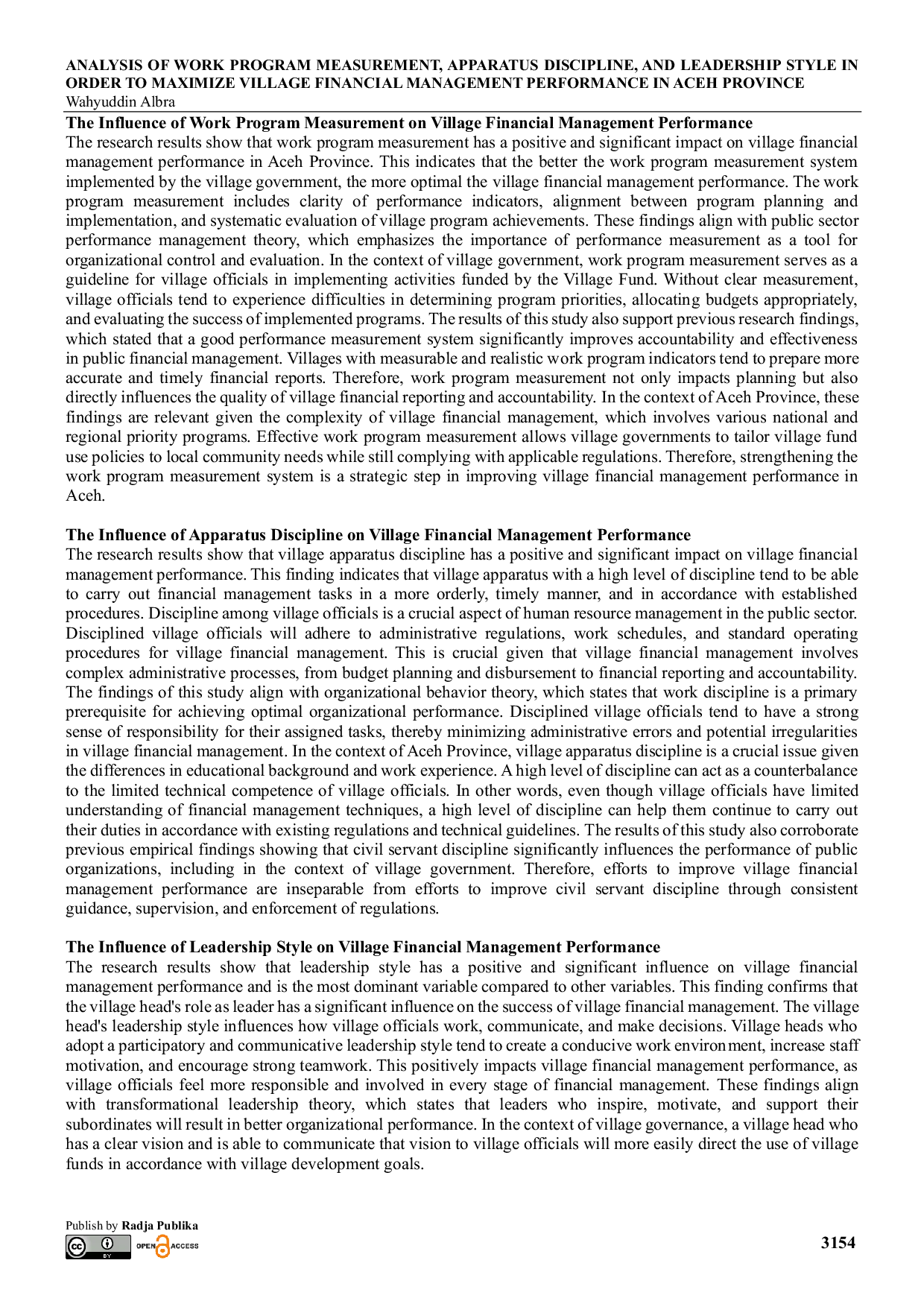 International Journal of Economic, Business, Accounting, Agriculture Management and Sharia Administration (IJEBAS)International Journal of Economic, Business, Accounting, Agriculture Management and Sharia Administration (IJEBAS)Penelitian ini bertujuan untuk menganalisis pengaruh pengukuran program kerja, disiplin aparatur, dan gaya kepemimpinan terhadap kinerja pengelolaan keuangan desa di Provinsi Aceh. Pengelolaan keuangan desa yang efektif dan akuntabel telah menjadi persyaratan krusial seiring dengan peningkatan alokasi Dana Desa dari pemerintah pusat. Namun, dalam praktiknya, berbagai permasalahan masih ditemukan terkait perencanaan, implementasi, dan akuntabilitas keuangan desa. Penelitian ini menggunakan pendekatan kuantitatif dengan desain penelitian asosiatif. Data diperoleh melalui penyebaran kuesioner kepada perangkat desa yang terlibat langsung dalam pengelolaan keuangan desa di Provinsi Aceh. Teknik analisis data yang digunakan meliputi uji validitas, uji reliabilitas, analisis statistik deskriptif, dan analisis regresi linear berganda untuk menguji pengaruh antarvariabel penelitian. Hasil penelitian menunjukkan bahwa pengukuran program kerja, disiplin aparatur, dan gaya kepemimpinan memiliki pengaruh positif dan signifikan terhadap kinerja pengelolaan keuangan desa. Di antara ketiga variabel ini, gaya kepemimpinan kepala desa memiliki pengaruh paling dominan. Temuan ini mengindikasikan bahwa kepemimpinan yang efektif dapat mendorong perangkat desa untuk bekerja lebih disiplin dan mengimplementasikan program kerja secara optimal. Penelitian ini memberikan kontribusi teoretis pada pengembangan studi administrasi publik, khususnya terkait pengelolaan keuangan desa. Secara praktis, hasil penelitian ini diharapkan menjadi dasar bagi pemerintah desa dan pemerintah daerah dalam merumuskan kebijakan dan strategi untuk meningkatkan kinerja pengelolaan keuangan desa di Provinsi Aceh.