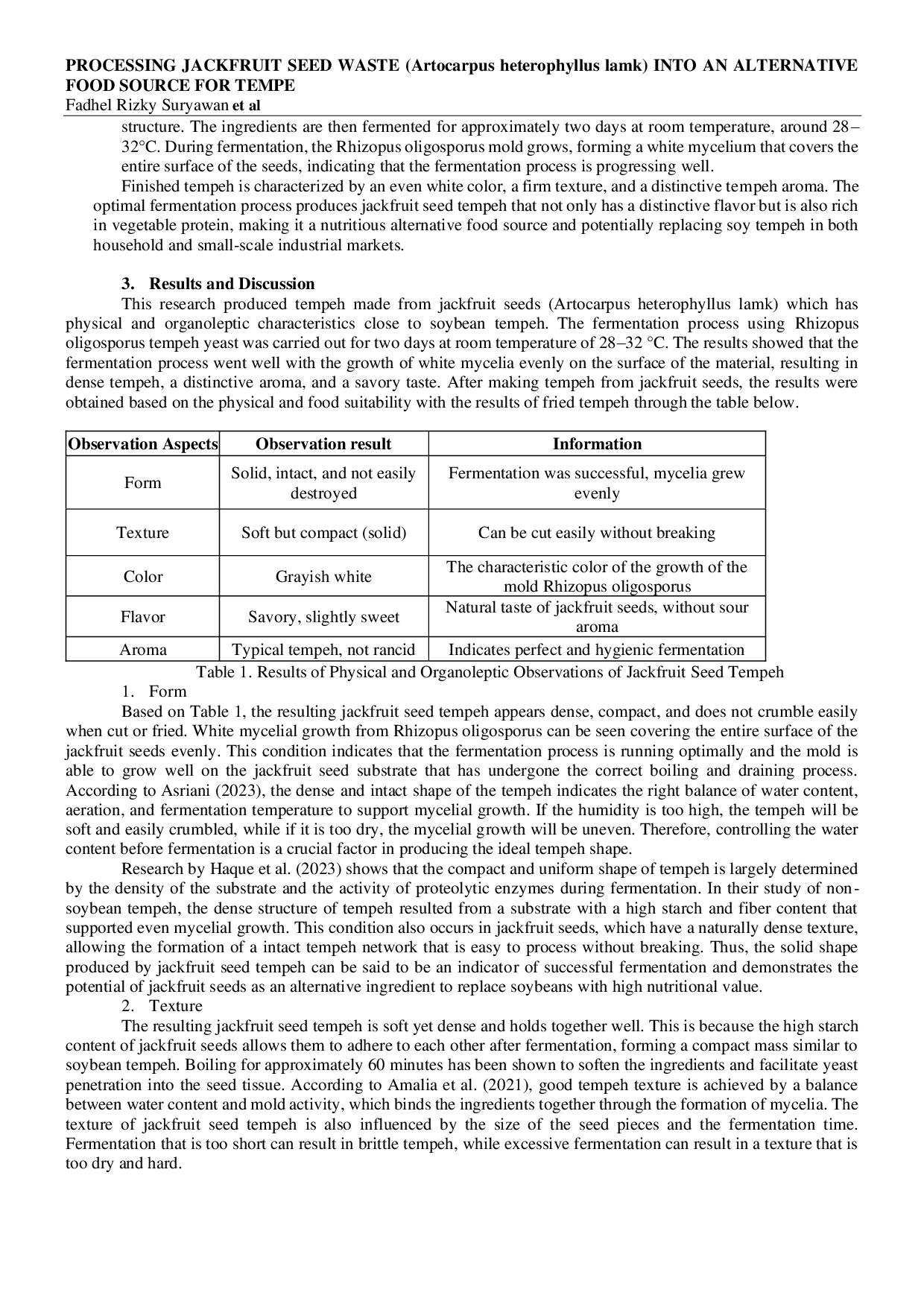 Based on the research results and discussion, it can be concluded that jackfruit seed tempeh (Artocarpus heterophyllus lamk) has good physical characteristics and is suitable as an alternative to soybean tempeh.In terms of shape, jackfruit seed tempeh shows a solid, compact, and not easily broken structure, indicating that the fermentation process is running optimally with the even growth of Rhizopus oligosporus mycelia.Its soft but dense texture is influenced by the high starch content and the boiling process that facilitates yeast penetration.The resulting grayish-white color indicates that fermentation is taking place under hygienic conditions without contamination from spoilage microbes.The savory and slightly sweet taste of jackfruit seed tempeh indicates a balance between proteolytic and amylolytic enzyme activity during fermentation.The distinctive aroma of fermentation is not pungent, indicating that microbial activity is taking place normally and cleanly.Nutritionally, jackfruit seed tempeh contains adequate amounts of protein, dietary fiber, and essential minerals, and its nutritional value increases through the fermentation process.