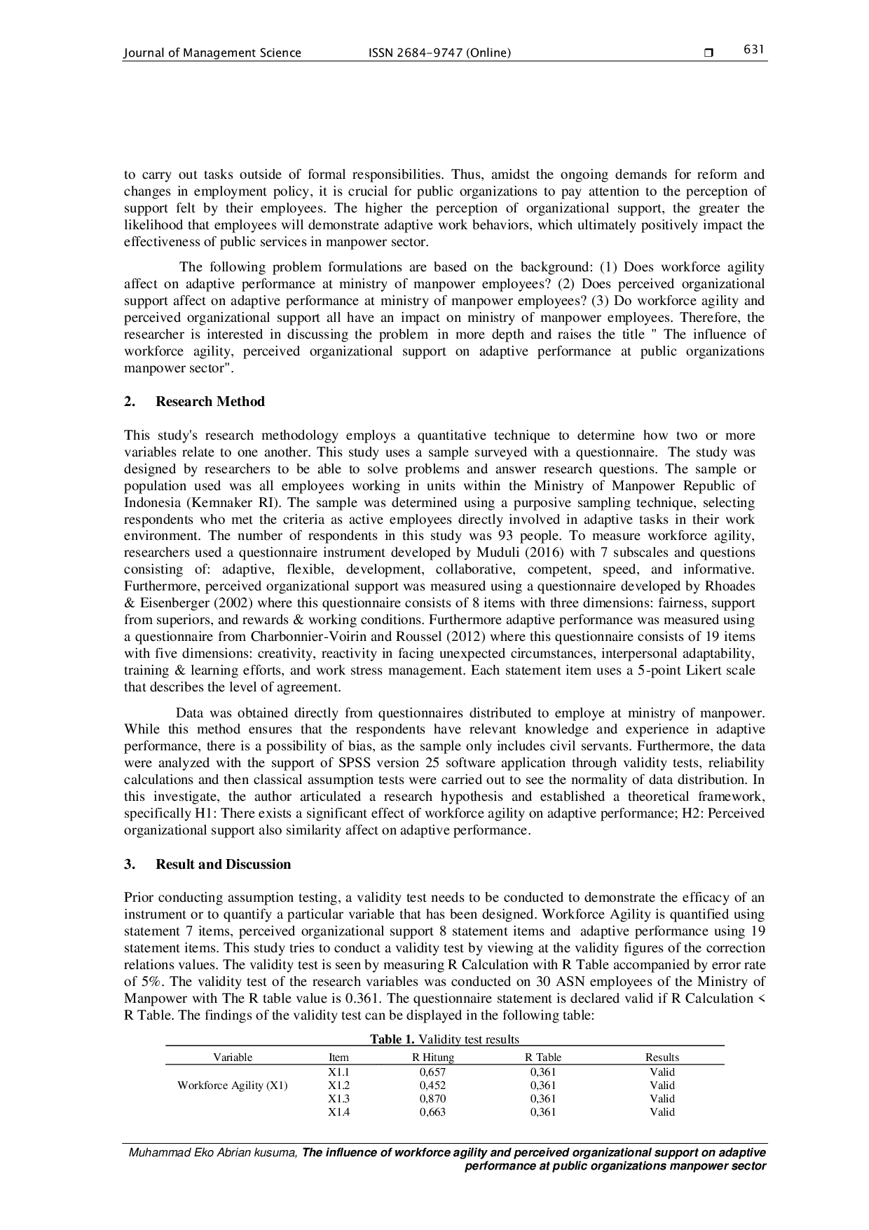 Journal of Management Science (JMAS)Journal of Management Science (JMAS)Adaptive performance is crucial for boosting the performance of public organizations. The Ministry of Manpower (Kemnaker), as the leading public organization responsible for the employment sector, needs to improve organizational governance and human resource adaptability to address the challenges of current environmental changes. This study aims to determine the role of workforce agility and perceived organization support on adaptive performance at public sector organizations in the manpower sector. The research method used was quantitative, with data collection through a survey. The population in this study was all civil servants (ASN) in the Ministry of Manpower of the Republic of Indonesia, using a purposive sampling technique, involving 93 respondents. Data analysis used IBM SPSS 25 software. The results of the regression analysis show that simultaneously, workforce agility and perceived organizational support have a significant effect on adaptive performance, with the calculated F value > F table and significance < 0.05. Partially, workforce agility (p = 0.000) has a significant effect on adaptive performance, while perceived organizational support (p = 0.069) does not show a direct significant effect. These findings indicate that employee work agility is a key factor in encouraging adaptability in manpower public organizations.