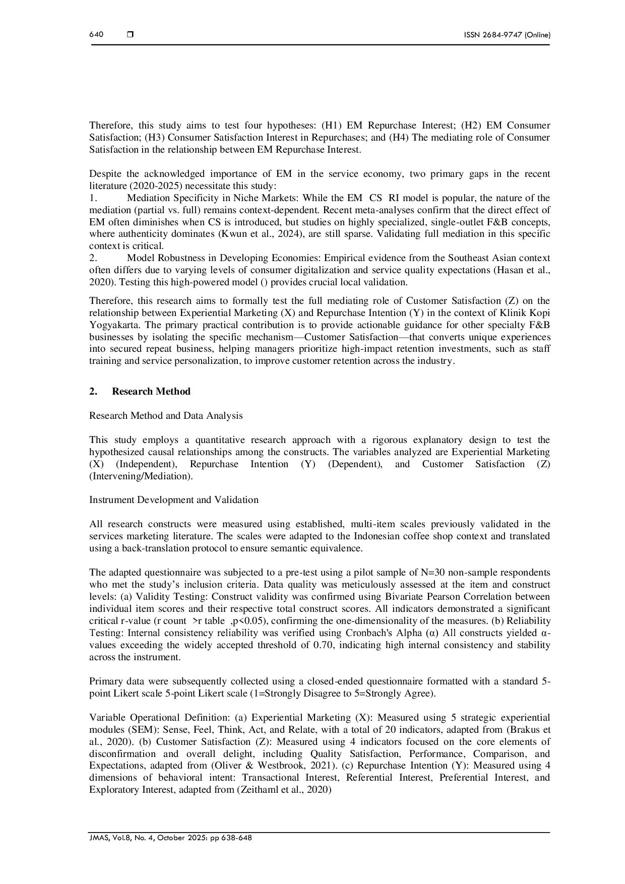 Journal of Management Science (JMAS)Journal of Management Science (JMAS)Persaingan pasar kedai kopi yang semakin ketat menuntut pergeseran strategi dari berorientasi produk menjadi berorientasi pengalaman. Studi ini meneliti pengaruh langsung dan tidak langsung dari Pemasaran Pengalaman (EM) terhadap Niat Pembelian Ulang (RI), yang dimediasi oleh Kepuasan Pelanggan (CS), menggunakan data dari 100 konsumen Klinik Kopi Yogyakarta. Dengan menggunakan pendekatan kuantitatif dan analisis jalur, studi ini mengkonfirmasi bahwa EM secara signifikan dan positif memengaruhi RI (β EM→RI =0.258) dan CS (β EM→CS =0.655), sementara CS adalah prediktor dominan dari RI (β CS→RI=0.762). Secara krusial, temuan menunjukkan bahwa Kepuasan Pelanggan sepenuhnya memediasi hubungan antara EM dan RI. Hasil ini menekankan perlunya pengalaman unik (EM) untuk berhasil diubah menjadi kepuasan psikologis yang mendalam (CS) sebelum dapat mendorong perilaku pembelian berulang secara berkelanjutan. Model ini menunjukkan daya jelaskan yang tinggi, yang menjelaskan 92,0% dari varians dalam Niat Pembelian Ulang.