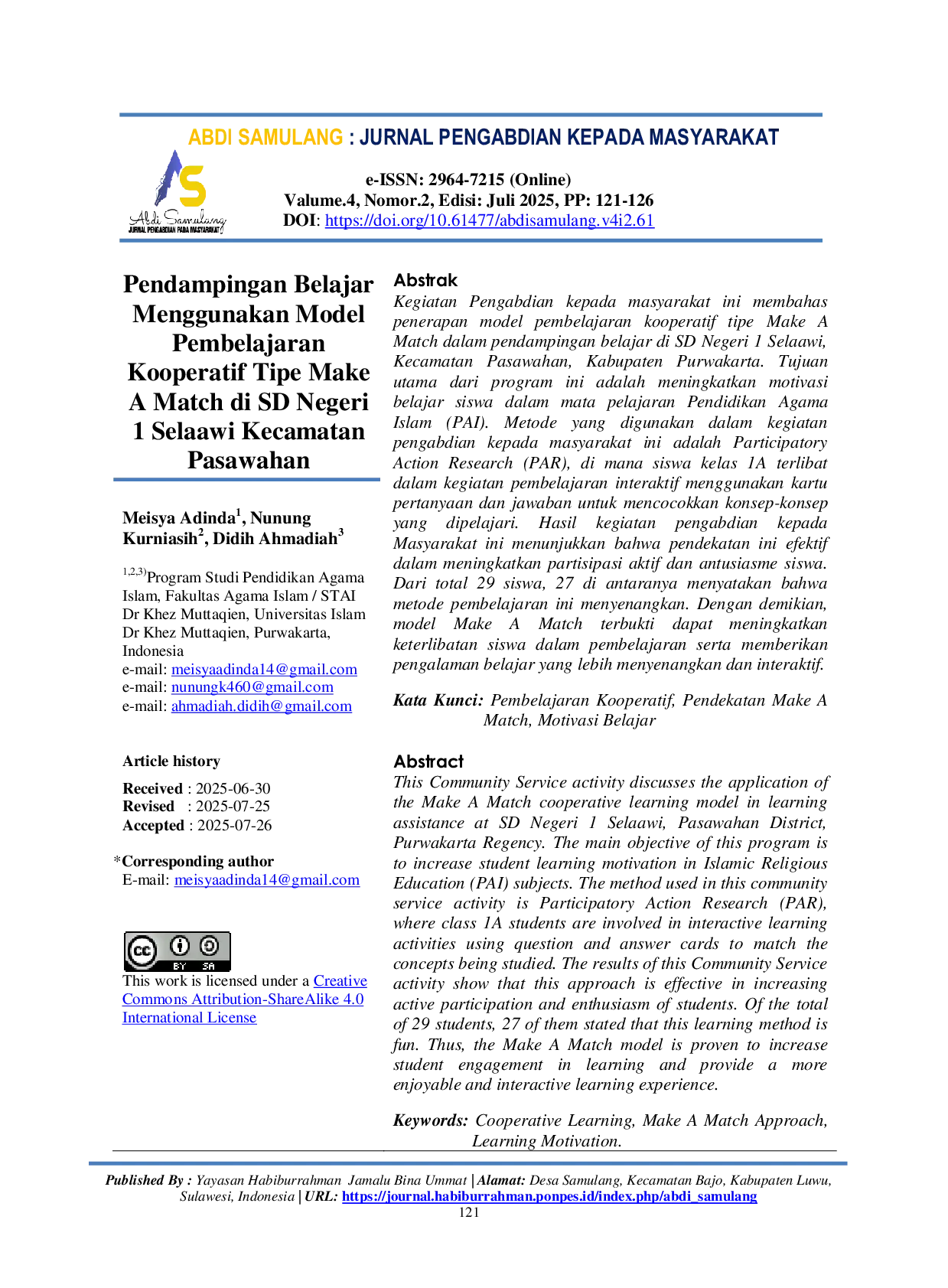 ABDI SAMULANG: Jurnal Pengabdian Kepada MasyarakatABDI SAMULANG: Jurnal Pengabdian Kepada MasyarakatKegiatan Pengabdian kepada masyarakat ini membahas penerapan model pembelajaran kooperatif tipe Make A Match dalam pendampingan belajar di SD Negeri 1 Selaawi, Kecamatan Pasawahan, Kabupaten Purwakarta. Tujuan utama dari program ini adalah meningkatkan motivasi belajar siswa dalam mata pelajaran Pendidikan Agama Islam (PAI). Metode yang digunakan dalam kegiatan pengabdian kepada masyarakat ini adalah Participatory Action Research (PAR), di mana siswa kelas 1A terlibat dalam kegiatan pembelajaran interaktif menggunakan kartu pertanyaan dan jawaban untuk mencocokkan konsep-konsep yang dipelajari. Hasil kegiatan pengabdian kepada Masyarakat ini menunjukkan bahwa pendekatan ini efektif dalam meningkatkan partisipasi aktif dan antusiasme siswa. Dari total 29 siswa, 27 di antaranya menyatakan bahwa metode pembelajaran ini menyenangkan. Dengan demikian, terbukti dapat meningkatkan keterlibatan siswa dalam pembelajaran serta memberikan pengalaman belajar yang lebih menyenangkan dan interaktif.