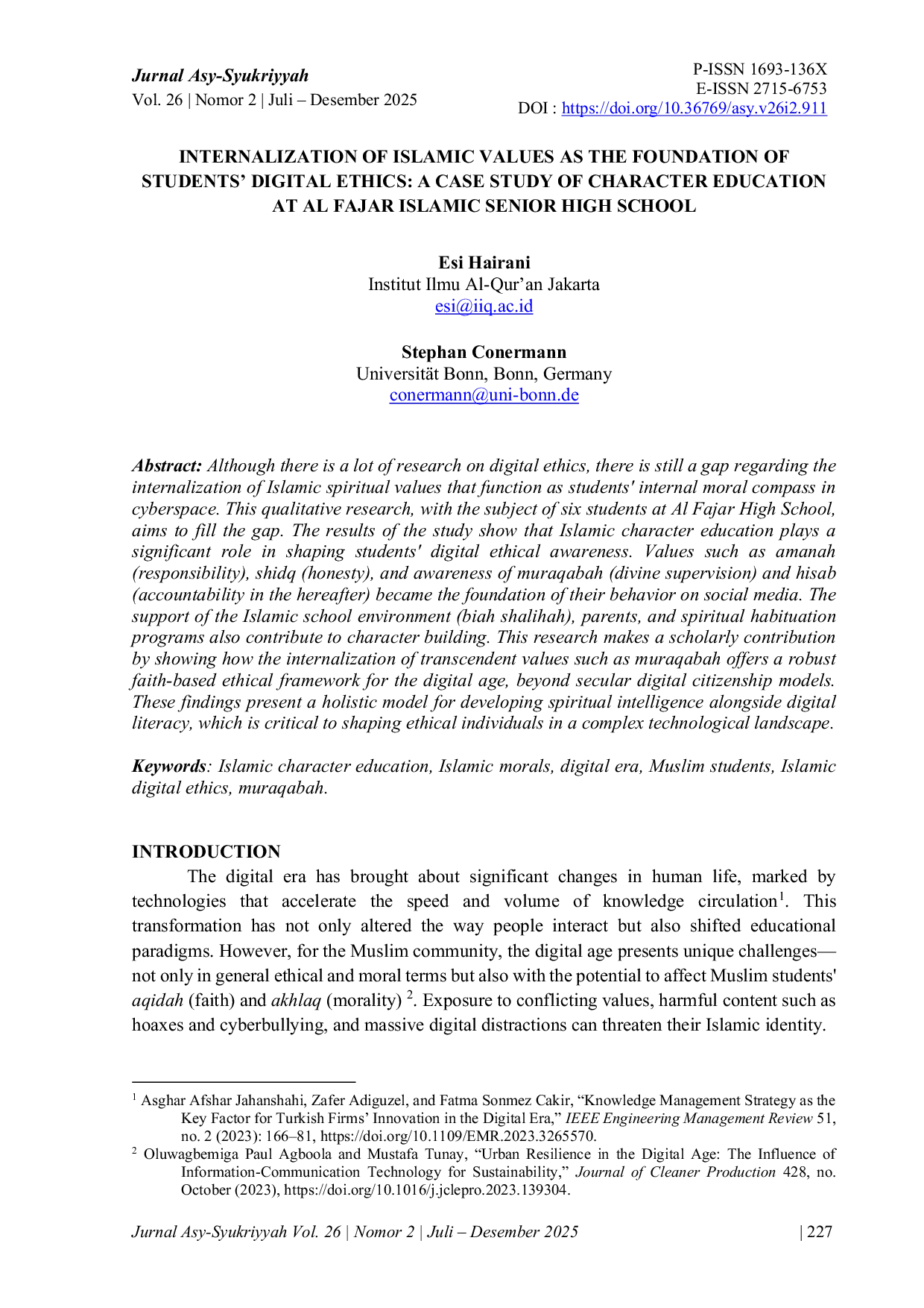 Jurnal Asy-SyukriyyahJurnal Asy-SyukriyyahMeskipun ada banyak penelitian tentang etika digital, masih ada kesenjangan mengenai internalisasi nilai-nilai spiritual Islam yang berfungsi sebagai kompas moral internal siswa di dunia maya. Penelitian kualitatif ini, dengan subjek enam siswa di SMA Al Fajar, bertujuan untuk mengisi kesenjangan tersebut. Hasil penelitian menunjukkan bahwa pendidikan karakter Islam memainkan peran signifikan dalam membentuk kesadaran etika digital siswa. Nilai-nilai seperti amanah (pertanggungjawaban), shidq (jujur), dan kesadaran akan muraqabah (pengawasan ilahi) dan hisab (pertanggungjawaban di akhirat) menjadi fondasi perilaku mereka di media sosial. Dukungan lingkungan sekolah Islam (biah shalihah), orang tua, dan program habituasi spiritual juga berkontribusi dalam pembentukan karakter. Penelitian ini memberikan kontribusi akademik dengan menunjukkan bagaimana internalisasi nilai-nilai transenden seperti muraqabah menawarkan kerangka etika berbasis iman yang kuat untuk era digital, melampaui model kewarganegaraan digital sekuler. Temuan ini menyajikan model holistik untuk mengembangkan kecerdasan spiritual bersama dengan literasi digital, yang sangat penting dalam membentuk individu yang etis di lanskap teknologi yang kompleks.