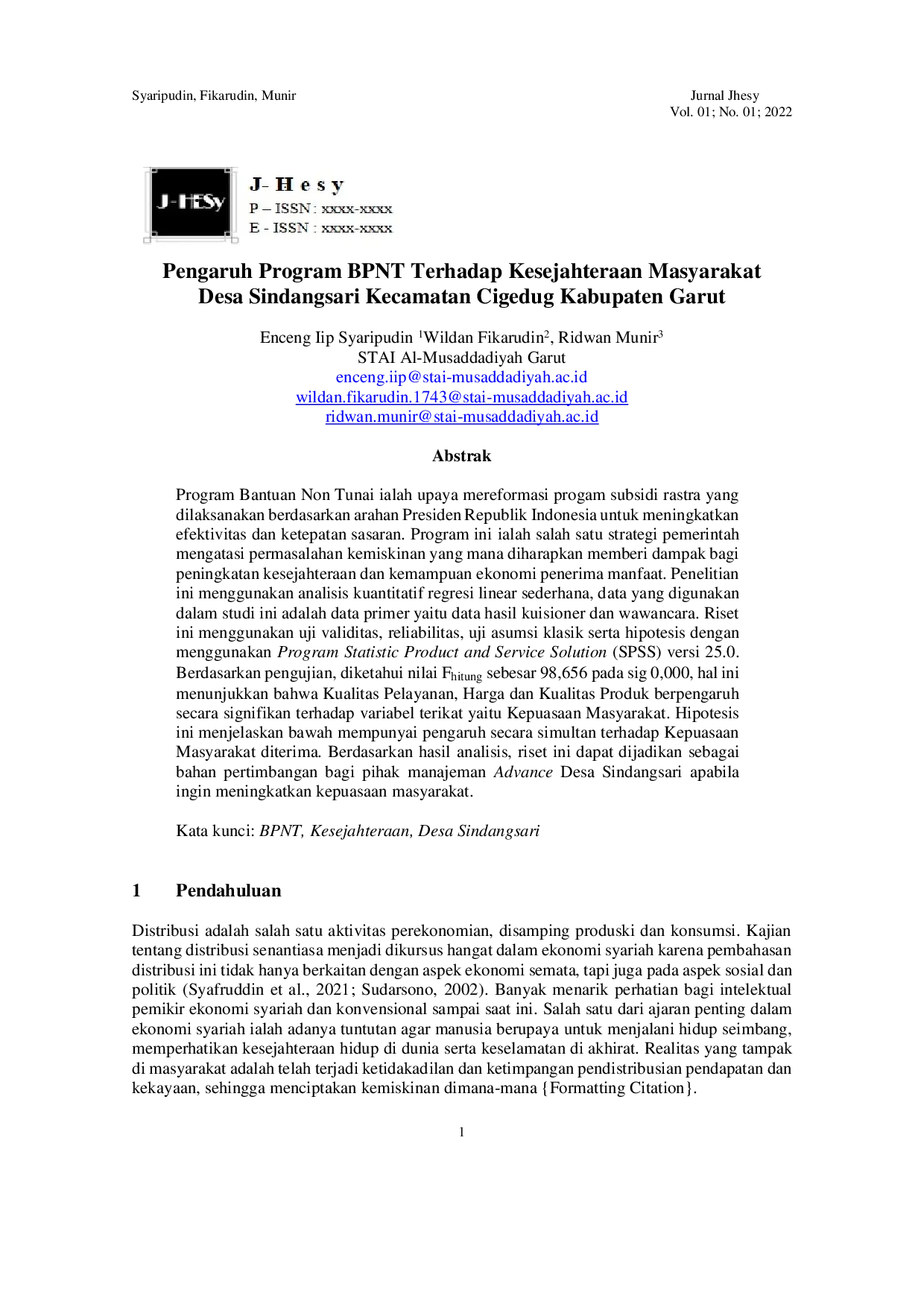 Jurnal Hukum Ekonomi SyariahJurnal Hukum Ekonomi SyariahProgram Bantuan Non Tunai ialah upaya mereformasi progam subsidi rastra yang dilaksanakan berdasarkan arahan Presiden Republik Indonesia untuk meningkatkan efektivitas dan ketepatan sasaran. Program ini ialah salah satu strategi pemerintah mengatasi permasalahan kemiskinan yang mana diharapkan memberi dampak bagi peningkatan kesejahteraan dan kemampuan ekonomi penerima manfaat. Penelitian ini menggunakan analisis kuantitatif regresi linear sederhana, data yang digunakan dalam studi ini adalah data primer yaitu data hasil kuisioner dan wawancara. Riset ini menggunakan uji validitas, reliabilitas, uji asumsi klasik serta hipotesis dengan menggunakan Program Statistic Product and Service Solution (SPSS) versi 25.0. Berdasarkan pengujian, diketahui nilai Fhitung sebesar 98,656 pada sig 0,000, hal ini menunjukkan bahwa Kualitas Pelayanan, Harga dan Kualitas Produk berpengaruh secara signifikan terhadap variabel terikat yaitu Kepuasaan Masyarakat. Hipotesis ini menjelaskan bawah mempunyai pengaruh secara simultan terhadap Kepuasaan Masyarakat diterima. Berdasarkan hasil analisis, riset ini dapat dijadikan sebagai bahan pertimbangan bagi pihak manajeman Advance Desa Sindangsari apabila ingin meningkatkan kepuasaan masyarakat.