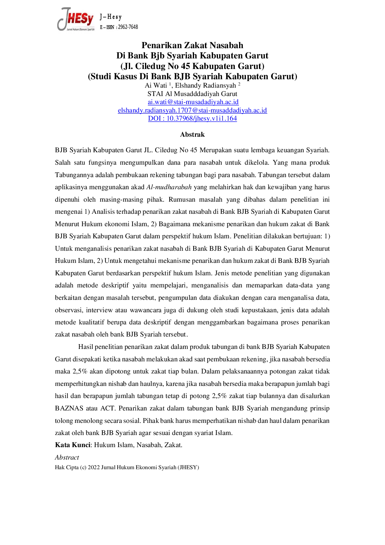 Jurnal Hukum Ekonomi SyariahJurnal Hukum Ekonomi SyariahBJB Syariah Kabupaten Garut merupakan lembaga keuangan Syariah yang mengumpulkan dana nasabah untuk dikelola melalui produk tabungan akad Al-mudharabah. Penelitian ini membahas analisis penarikan zakat nasabah di Bank BJB Syariah Kabupaten Garut menurut hukum ekonomi Islam dan mekanisme serta hukum zakat dari perspektif hukum Islam. Metode penelitian yang digunakan adalah deskriptif kualitatif dengan pengumpulan data melalui analisis data, observasi, wawancara, dan studi kepustakaan. Hasil penelitian menunjukkan bahwa penarikan zakat disepakati saat pembukaan rekening dengan pemotongan 2,5% setiap bulan tanpa memperhitungkan nishab dan haul, yang kemudian disalurkan melalui BAZNAS atau ACT. Penarikan zakat ini mengandung prinsip tolong menolong secara sosial, namun pihak bank perlu memperhatikan nishab dan haul agar sesuai dengan syariat Islam.