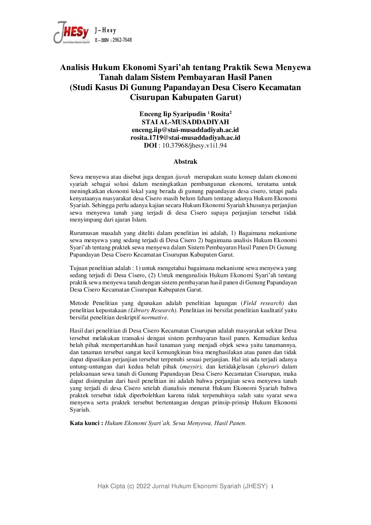 Analisis Hukum Ekonomi Syariah Tentang Praktik Sewa Menyewa Tanah dengan Sistem Pembayaran Hasil Panen di Gunung Papandayan Kecamatan Cisurupan Kabupaten Garut berdasarkan hasil penelitian yang dilakukan peneliti, maka praktik sewa tanah yang terjadi di Gunung Papandayan Desa Cisero Kecamatan Cisurupan tidak sesuai dengan prinsip‑prinsip Hukum Ekonomi Syariah, diantaranya adanya unsur ketidakjelasan (Gharar) dan ada unsur untung‑untungan (Maysir).