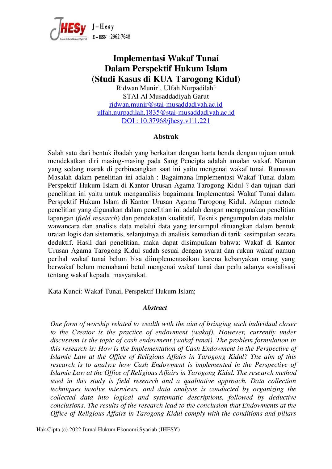 UADUAD Hasil penelitian menunjukan bahwa prosedur peralihan hak cipta sebagai objek wakaf secara teknis sama dengan objek wakaf yang lain, yang membedakan hanyaHasil penelitian menunjukan bahwa prosedur peralihan hak cipta sebagai objek wakaf secara teknis sama dengan objek wakaf yang lain, yang membedakan hanya