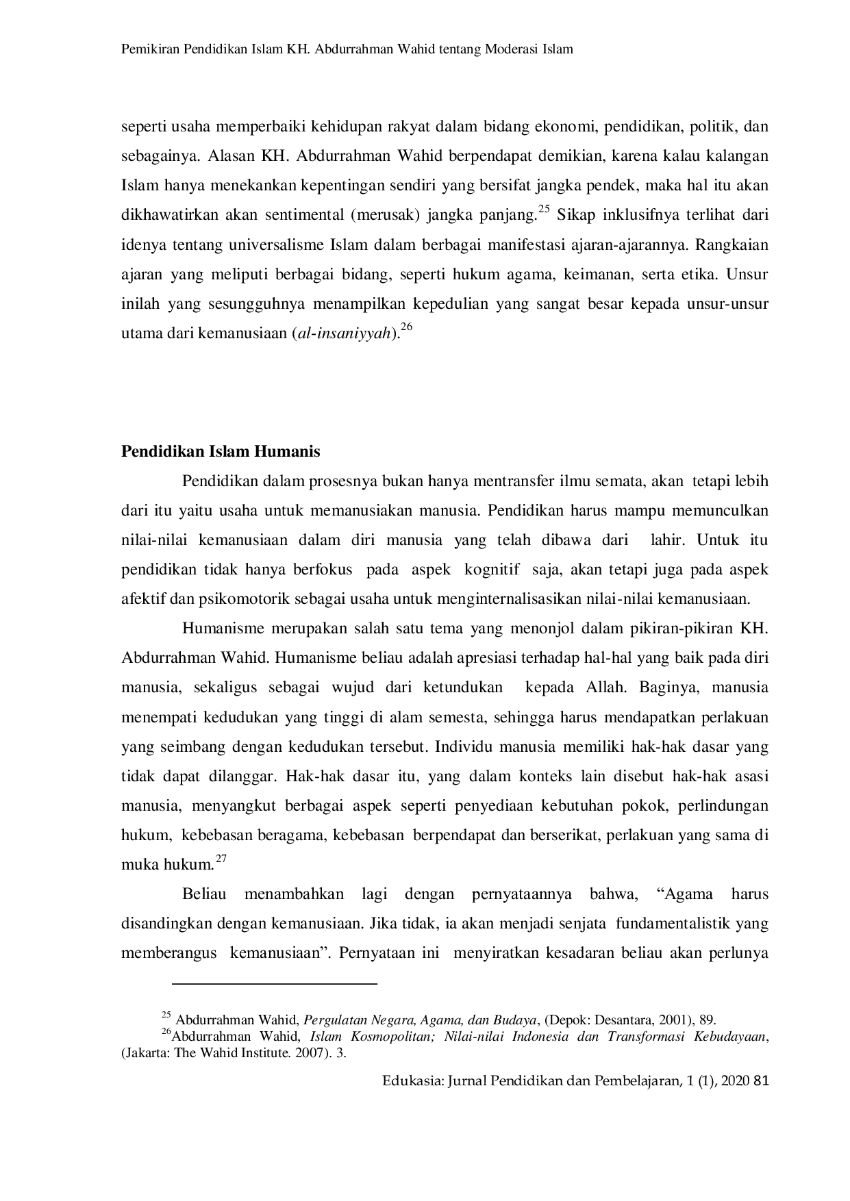 EDUKASIA Jurnal Pendidikan dan PembelajaranEDUKASIA Jurnal Pendidikan dan PembelajaranKajian ilmiah ini menjelaskan tentang langkah strategis moderasi pendidikan Islam dengan melakukan deradikalisasi dan deideologisasi. Salah satu tokoh yang inten dan concern dalam mengeksprsikan Islam yang moderat ialah KH. Abdurrahman Wahid. Ide dan gagasan beliau patut untuk diinterpretasikan dalam perspektif pendidikan Islam. Fokus permasalahan ditekankan pada pemikiran Gus Dur mengenai pendidikan Islam, untuk kemudian dirumuskan dalam suatu model deradikalisasi melalui pendidikan. Metode yang digunakan adalah studi kepustakaan dengan analisis isi (content analysis). Hasil penelitian menemukan bahwa pemikiran Gus Dur berimplikasi terhadap pendidikan Islam yang pada implementasinya bercorak Pendidikan Islam berbasis Neo-Modernis, berbasis pembebasan, berbasis multikultural, Pendidikan Islam yang inklusif, serta Pendidikan Islam humanis. Kelima pendekatan tersebut telah menopang struktur sentral pendidikan Islam rahmatan lil alamin yang mendasari model deradikalisasi dan deideologisasi pendidikan Islam.