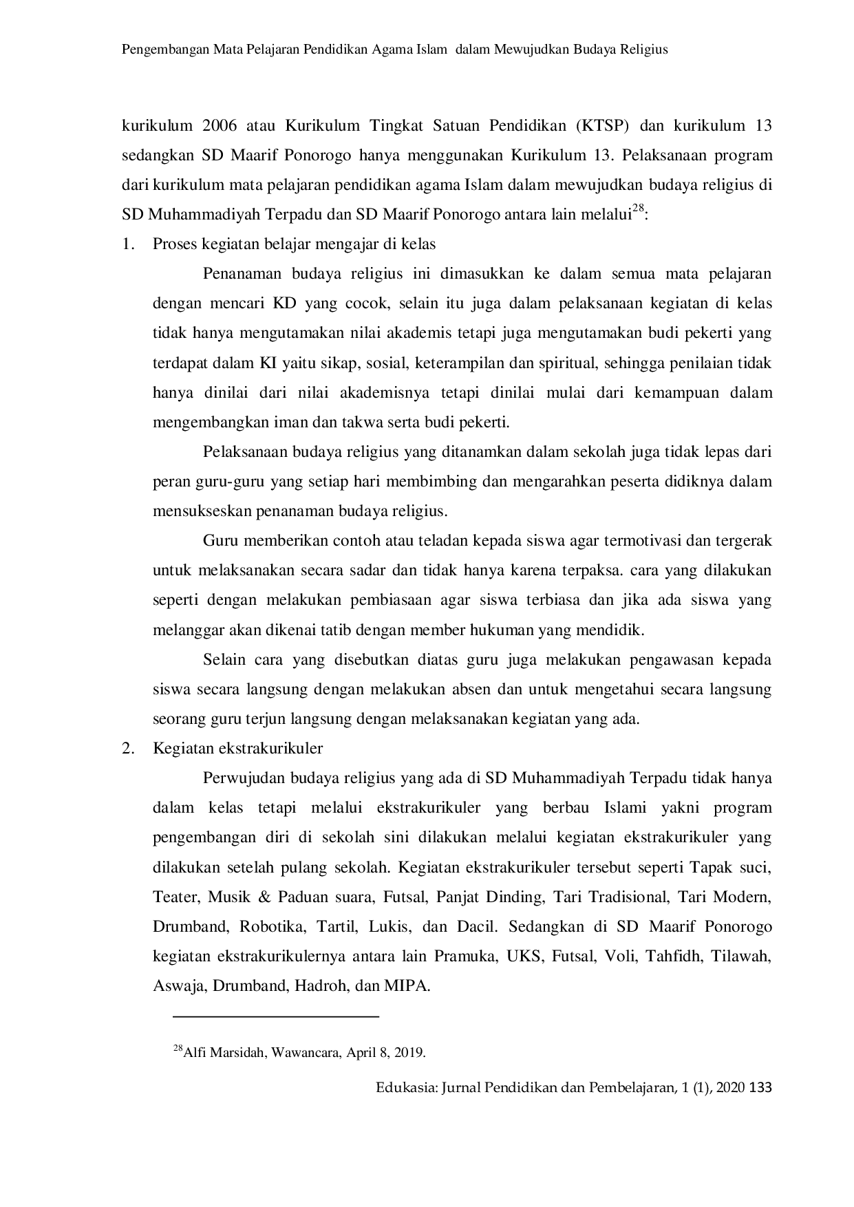 EDUKASIA Jurnal Pendidikan dan PembelajaranEDUKASIA Jurnal Pendidikan dan PembelajaranImplementasi kurikulum pendidikan Islam kurang optimal di sekolah negeri. Ini menghasilkan penurunan moral pada generasi muda. Menjawab masalah ini, budaya agama berusaha diwujudkan melalui penerapan kurikulum pendidikan agama Islam. Penelitian ini menggunakan pendekatan kualitatif. Data dikumpulkan melalui observasi, wawancara dan dokumentasi. Validitas data diukur dengan perpanjangan pengamatan, ketekunan pengamatan, triangulasi, dan pengecekan. Hasil penelitian menunjukkan budaya agama di Sekolah Dasar Muhammadiyah Terpadu dan Sekolah Dasar Maarif Ponorogo, yaitu shalat Dhuha, Senyum, Salam, Salam, berjabat tangan, toleransi, sholat Dzikir, tadarus Al-Quran, istighosah dan doa bersama. Implementasi kurikulum pendidikan agama Islam dalam mewujudkan budaya agama di Sekolah Dasar Muhammadiyah Terpadu dan Sekolah Dasar Maarif Ponorogo adalah melalui proses kegiatan belajar mengajar di kelas dan kedua melalui kegiatan ekstrakurikuler.