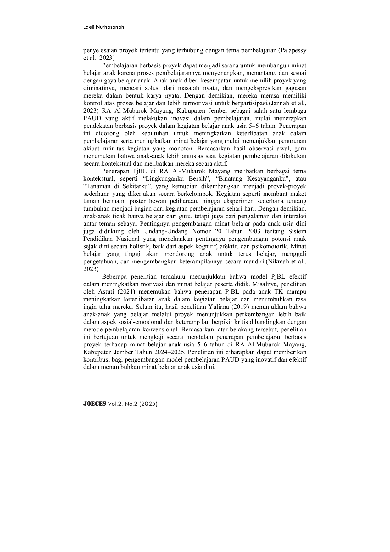 Penerapan pembelajaran berbasis proyek di RA Al-Mubarok Mayang terbukti mampu meningkatkan minat belajar anak usia 5–6 tahun secara signifikan.Anak-anak menunjukkan peningkatan dalam berbagai aspek, termasuk keterlibatan aktif dalam kegiatan, rasa percaya diri, kemampuan sosial, serta antusiasme yang tinggi terhadap proses pembelajaran.