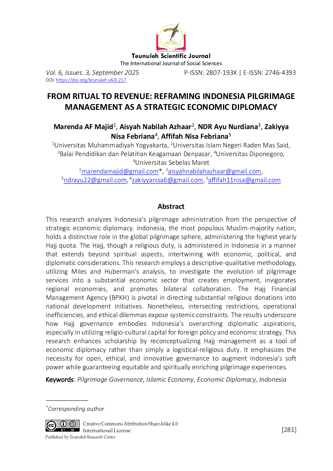 Jurnal Ilmiah TeunulehJurnal Ilmiah TeunulehThis research analyzes Indonesias pilgrimage administration from the perspective of strategic economic diplomacy. Indonesia, the most populous Muslim-majority nation, holds a distinctive role in the global pilgrimage sphere, administering the highest yearly Hajj quota. The Hajj, though a religious duty, is administered in Indonesia in a manner that extends beyond spiritual aspects, intertwining with economic, political, and diplomatic considerations. This research employs a descriptive-qualitative methodology, utilizing Miles and Hubermans analysis, to investigate the evolution of pilgrimage services into a substantial economic sector that creates employment, invigorates regional economies, and promotes bilateral collaboration. The Hajj Financial Management Agency (BPKH) is pivotal in directing substantial religious donations into national development initiatives. Nonetheless, intersecting restrictions, operational inefficiencies, and ethical dilemmas expose systemic constraints. The results underscore how Hajj governance embodies Indonesias overarching diplomatic aspirations, especially in utilizing religio-cultural capital for foreign policy and economic strategy. This research enhances scholarship by reconceptualizing Hajj management as a tool of economic diplomacy rather than simply a logistical-religious duty. It emphasizes the necessity for open, ethical, and innovative governance to augment Indonesias soft power while guaranteeing equitable and spiritually enriching pilgrimage experiences.