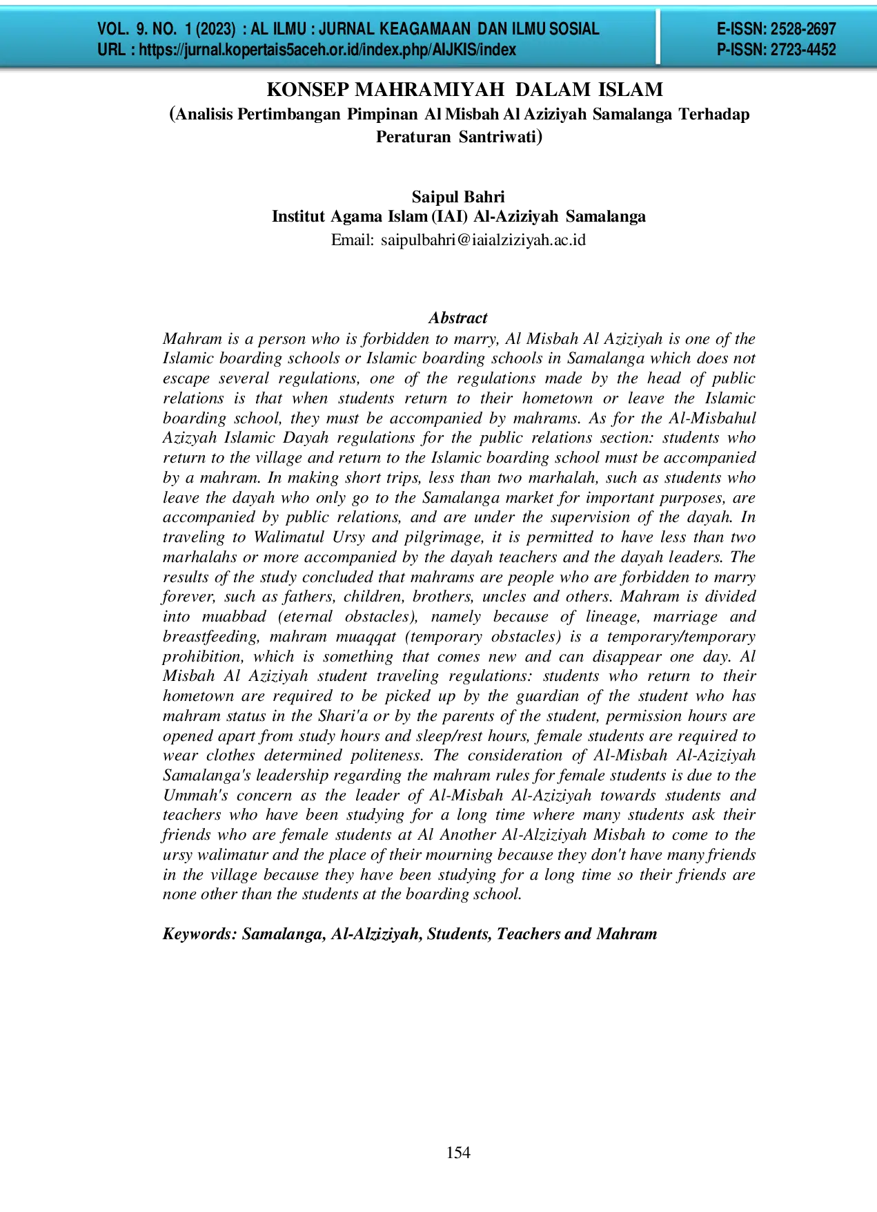 AL-ILMU : Jurnal Keagamaan dan Ilmu SosialAL-ILMU : Jurnal Keagamaan dan Ilmu SosialMahram adalah orang yang haram dinikahi, Al Misbah Al Aziziyah adalah salah satu pesantren atau dayah yang berada di Samalanga yang tidak luput dari beberapa peraturan, peraturan yang telah dibuat oleh kabag humas salah satunya yaitu disaat santri kembali ke kampung halamannya atau keluar dari dayah wajib didampingi oleh mahram. Adapun peraturan dayah Al-Misbahul Azizyah bagian kehumasan: santri yang pulang ke kempung dan kembali ke dayah wajib didampingi oleh mahram. Dalam melakukan perjalanan pendek tidak sampai dua marhalah, seperti santri yang keluar dari dayah yang hanya kepasar samalanga untuk keperluan penting, didampingi oleh humas, dan dalam pengawasan dayah. Dalam melakukan perjalanan ke walimatul ursy dan ziarah baik kurang dari dua marhalah atau lebih diizinkan dengan didampingi oleh guru-guru dayah dan pimpinan dayah. Hasil penelitian menyimpulkan bahwa mahram adalah orang-orang yang haram untuk dinikahi selama-lamanya seperti bapak, anak, saudara, paman dan lain-lain. Mahram terbagi kepada muabbad (halangan-halangan abadi) yaitu karena nasab, perkawinan dan persusuan, mahram muaqqat (halangan-halangan sementara) adalah keharaman Temporer/sementara adalah suatu yang datang baru dan bisa lenyap suatu ketika. Peraturan safar santriwati Al Misbah Al Aziziyah: santriwati yang pulang ke kampung halaman diwajibkan dijemput oleh wali santriwati tersebut yang berstatus mahram dalam syariat ataupun dengan orang tua santriwati tersebut, jam perizinan dibuka selain jam belajar dan jam tidur/istirahat, bagi santriwati diwajibkan memakai pakaian sopan yang telah ditentukan.Pertimbanagn pimpinan Al-Misbah Al-Aziziyah Samalanga terhadap aturan mahram bagi santriwati yaitu dikarenakan rasa perihatin Ummah selaku pimpinan Al-Misbah Al- Aziziyah terhadap santri dan guru yang sudah lama mondok dimana banyak santri memohon kawannya yang merupakan santriwati di Al Misbah Al-Alziziyah lain untuk datang walimatur ursy dan tempat duka mereka karena mereka tidak memiliki banyak teman di kampung disebabkan sudah lama mondok maka tidak lain temannya hanyalah santri ditempat mondok.
