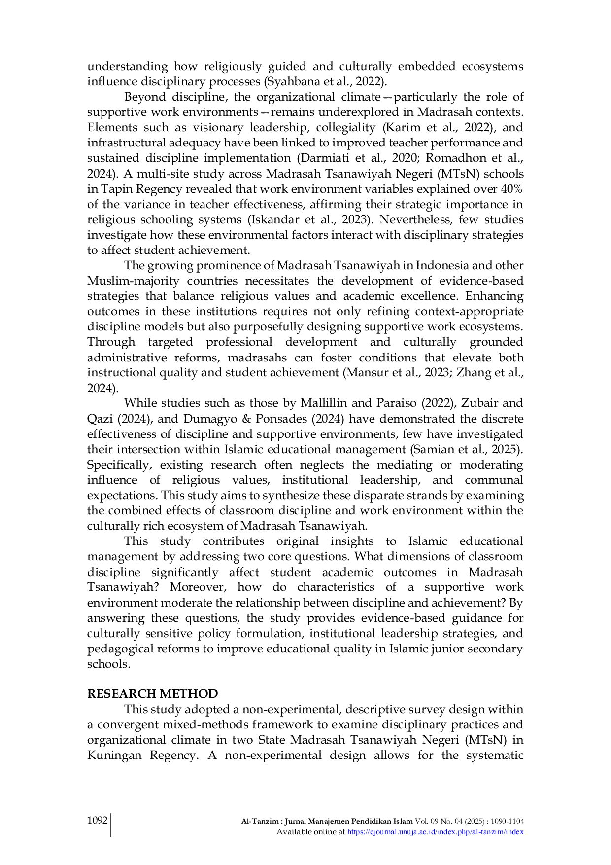 Al-Tanzim: Jurnal Manajemen Pendidikan IslamAl-Tanzim: Jurnal Manajemen Pendidikan IslamPenelitian ini bertujuan menganalisis pengaruh disiplin kelas dan lingkungan kerja terhadap kinerja guru Madrasah Tsanawiyah, serta mengembangkan model konseptual Discipline–Environment Symbiosis Model (DESM) dalam konteks pendidikan Islam.