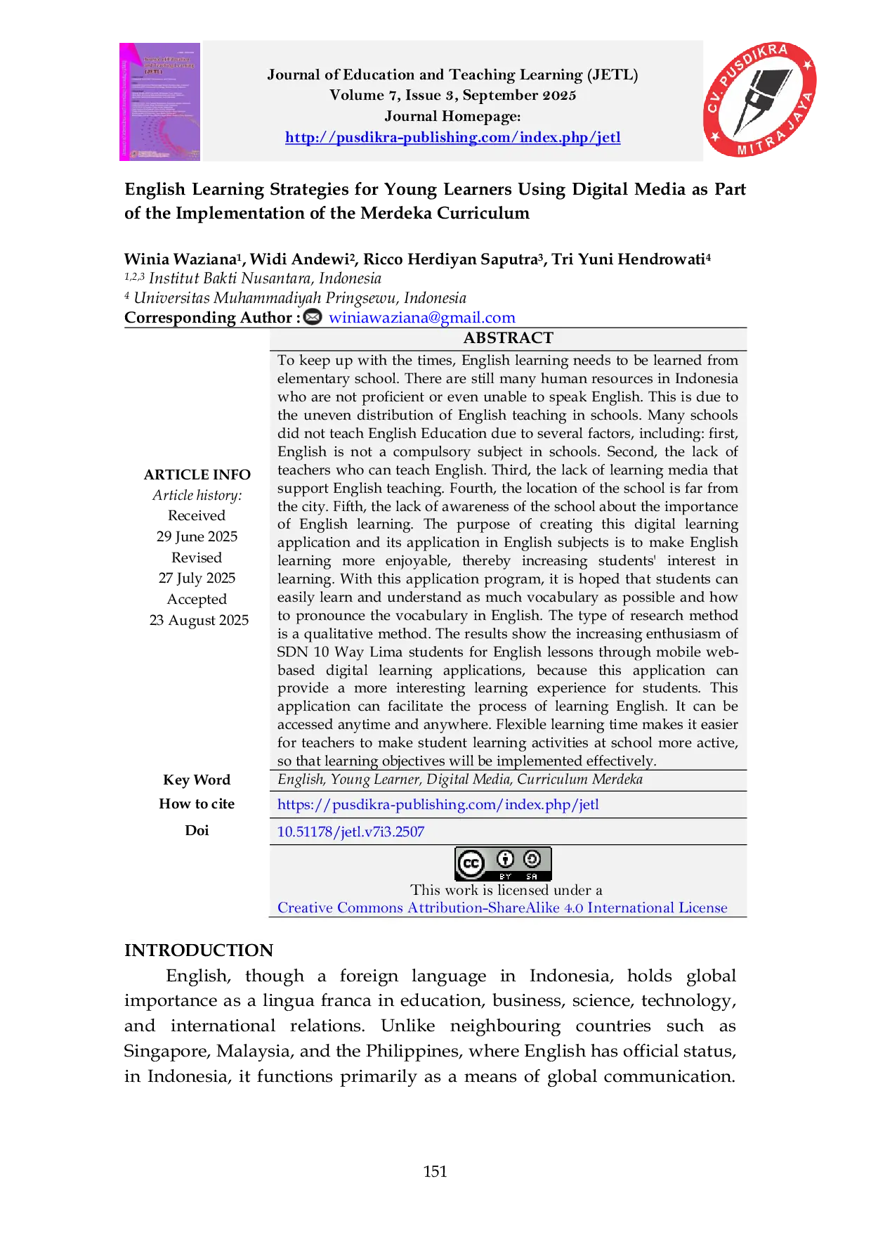 Journal Of Education And Teaching Learning (JETL)Journal Of Education And Teaching Learning (JETL)Untuk mengimbangi perkembangan zaman, pembelajaran bahasa Inggris perlu dimulai sejak usia dini. Masih banyak sumber daya manusia di Indonesia yang tidak mahir atau bahkan tidak mampu berbahasa Inggris. Hal ini disebabkan oleh distribusi pengajaran bahasa Inggris yang tidak merata di sekolah. Banyak sekolah tidak mengajarkan Pendidikan Bahasa Inggris karena beberapa faktor, termasuk: pertama, bahasa Inggris bukan mata pelajaran wajib di sekolah. Kedua, kurangnya guru yang dapat mengajar bahasa Inggris. Ketiga, kurangnya media pembelajaran yang mendukung pengajaran bahasa Inggris. Keempat, lokasi sekolah jauh dari kota. Kelima, kurangnya kesadaran sekolah tentang pentingnya pembelajaran bahasa Inggris. Tujuan dari pembuatan aplikasi pembelajaran digital ini dan penerapannya dalam mata pelajaran bahasa Inggris adalah untuk membuat pembelajaran bahasa Inggris lebih menyenangkan, sehingga meningkatkan minat siswa dalam belajar. Dengan program aplikasi ini, diharapkan siswa dapat dengan mudah mempelajari dan memahami sebanyak mungkin kosakata dan cara pengucapan kosakata dalam bahasa Inggris. Jenis penelitian yang digunakan adalah metode kualitatif. Hasil penelitian menunjukkan peningkatan antusiasme siswa SDN 10 Way Lima terhadap pelajaran bahasa Inggris melalui aplikasi pembelajaran digital berbasis mobile web, karena aplikasi ini dapat memberikan pengalaman belajar yang lebih menarik bagi siswa. Aplikasi ini dapat memfasilitasi proses pembelajaran bahasa Inggris. Aplikasi ini dapat diakses kapan saja dan di mana saja. Fleksibilitas waktu belajar memudahkan guru untuk membuat kegiatan belajar siswa di sekolah lebih aktif, sehingga tujuan pembelajaran akan dilaksanakan secara efektif.