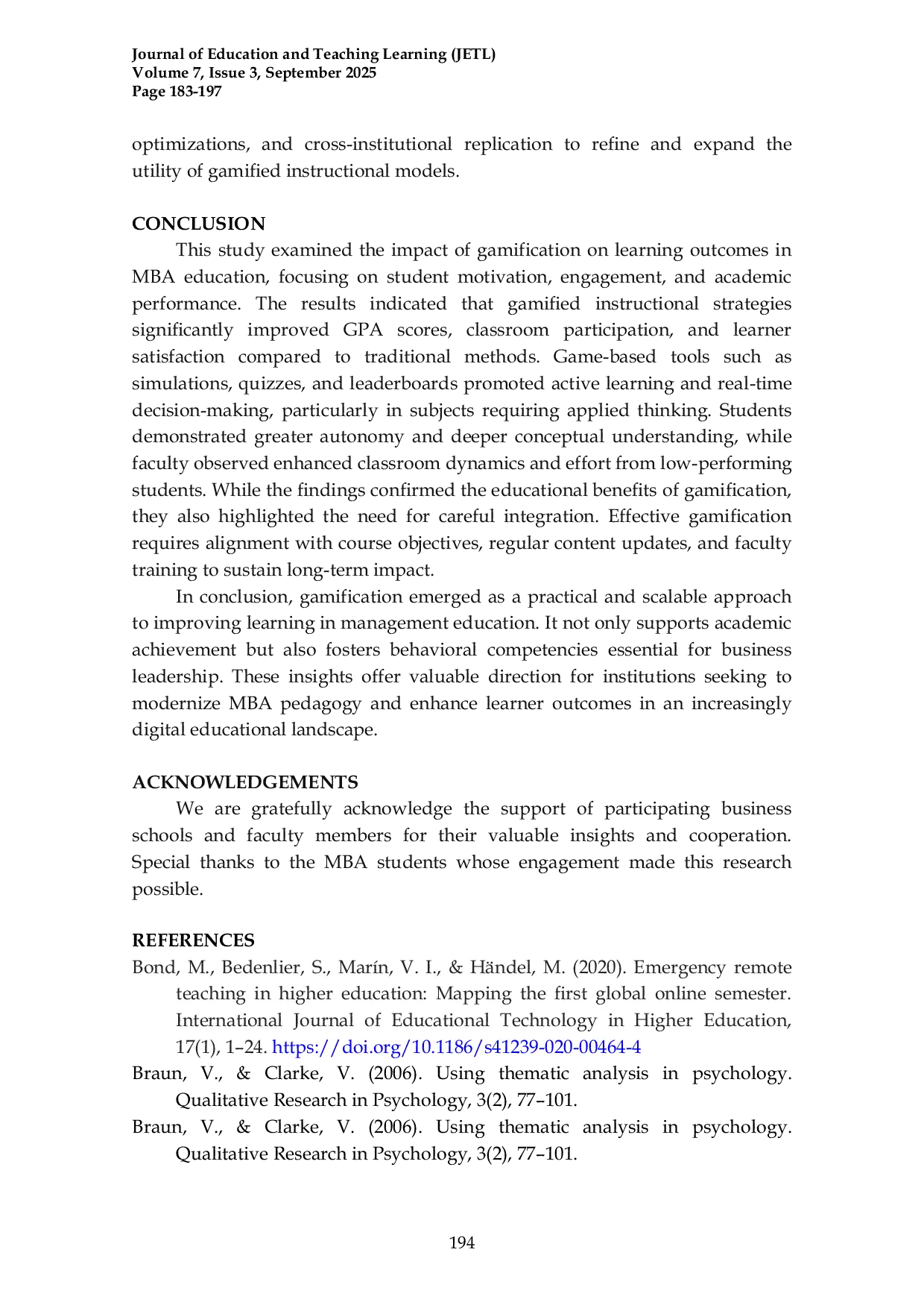 Journal Of Education And Teaching Learning (JETL)Journal Of Education And Teaching Learning (JETL)Penelitian ini mengeksplorasi integrasi teknologi pembelajaran berbasis game dalam pendidikan manajemen untuk mengevaluasi pengaruhnya terhadap keterlibatan mahasiswa, motivasi, dan prestasi akademik. Desain penelitian campuran yang mencakup survei, observasi kelas, dan data prestasi akademik dari 150 mahasiswa MBA di lima sekolah bisnis India digunakan. Analisis kuantitatif menunjukkan peningkatan motivasi, tingkat partisipasi, dan skor akademik secara signifikan pada kelompok yang menggunakan gamifikasi. Umpan balik kualitatif dari diskusi kelompok fokus menekankan preferensi mahasiswa terhadap aktivitas berbasis tantangan dibandingkan pelajaran konvensional. Penelitian ini menyarankan pengintegrasian modul gamifikasi terstruktur yang selaras dengan outcome mata kuliah dan aplikasi industri.