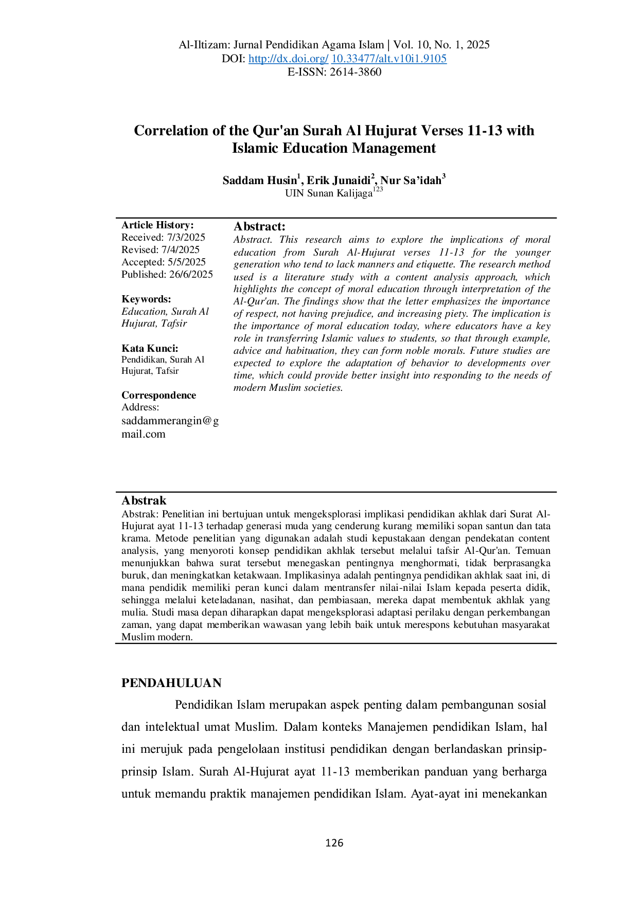Untuk penelitian lanjutan, disarankan untuk fokus pada pengembangan model manajemen pendidikan yang lebih baik, yang tidak hanya fokus pada pencapaian akademis tetapi juga pada pembentukan karakter dan moralitas siswa sesuai dengan ajaran Islam. Penelitian dapat mengeksplorasi strategi implementasi nilai-nilai etika dalam pendidikan Islam, dengan menekankan pentingnya pendidikan akhlak dan peran pendidik dalam mentransfer nilai-nilai Islam. Selain itu, penelitian dapat menyelidiki korelasi antara Surah Al-Hujurat ayat 11-13 dengan manajemen pendidikan Islam di pesantren, serta mengkaji bagaimana nilai-nilai tersebut diterapkan dalam sistem pendidikan Islam modern.