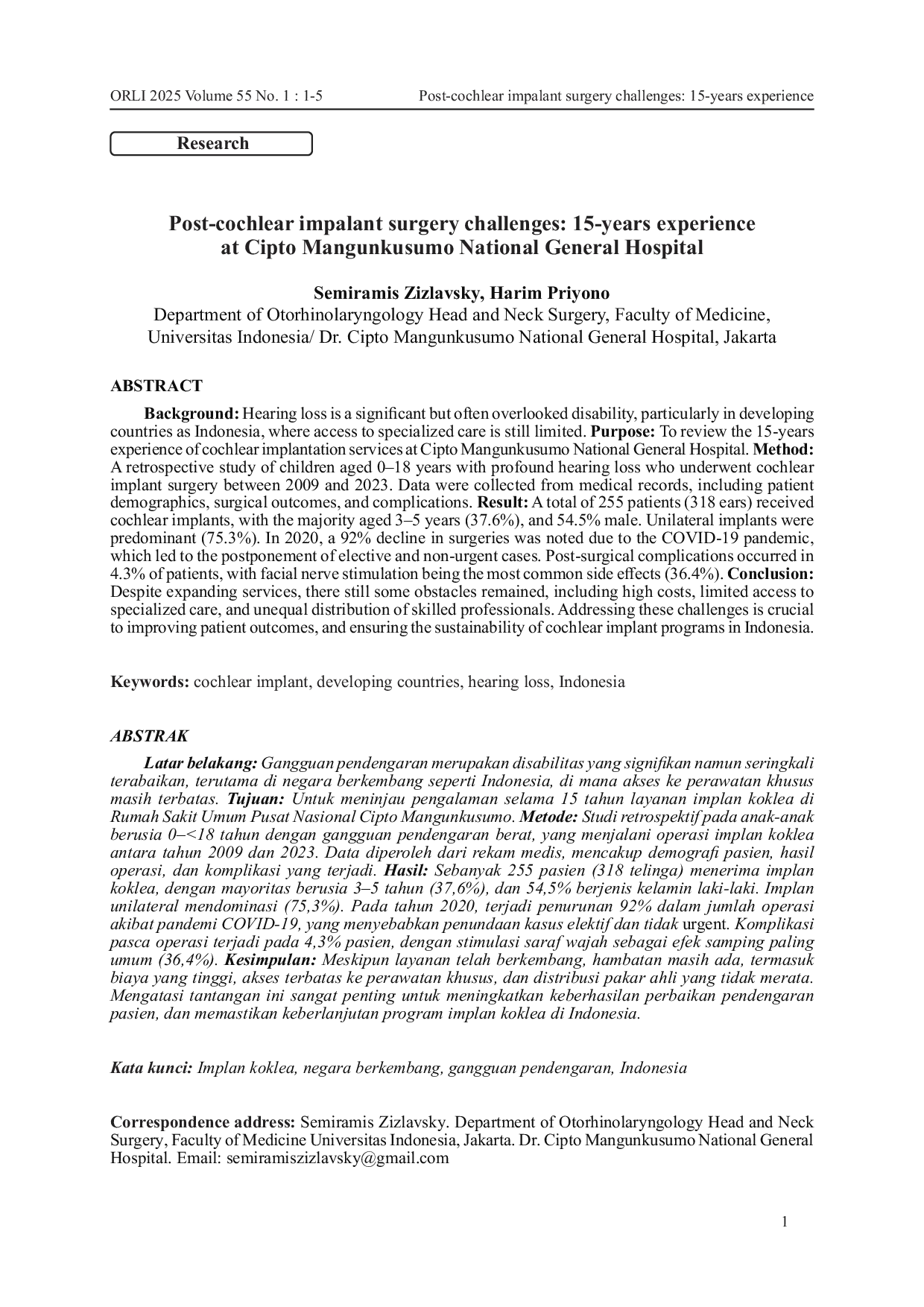 Oto Rhino Laryngologica IndonesianaOto Rhino Laryngologica IndonesianaGangguan pendengaran merupakan disabilitas yang signifikan namun seringkali terabaikan, terutama di negara berkembang seperti Indonesia, di mana akses ke perawatan khusus masih terbatas. Studi retrospektif ini meninjau pengalaman selama 15 tahun layanan implan koklea di Rumah Sakit Umum Pusat Nasional Cipto Mangunkusumo pada anak-anak berusia 0–18 tahun dengan gangguan pendengaran berat. Hasil penelitian menunjukkan bahwa sebanyak 255 pasien (318 telinga) menerima implan koklea, dengan mayoritas berusia 3–5 tahun (37,6%), dan 54,5% berjenis kelamin laki-laki. Komplikasi pasca operasi terjadi pada 4,3% pasien, dengan stimulasi saraf wajah sebagai efek samping paling umum (36,4%). Meskipun layanan telah berkembang, hambatan masih ada, termasuk biaya yang tinggi, akses terbatas ke perawatan khusus, dan distribusi pakar ahli yang tidak merata. Mengatasi tantangan ini sangat penting untuk meningkatkan keberhasilan perbaikan pendengaran pasien, dan memastikan keberlanjutan program implan koklea di Indonesia.