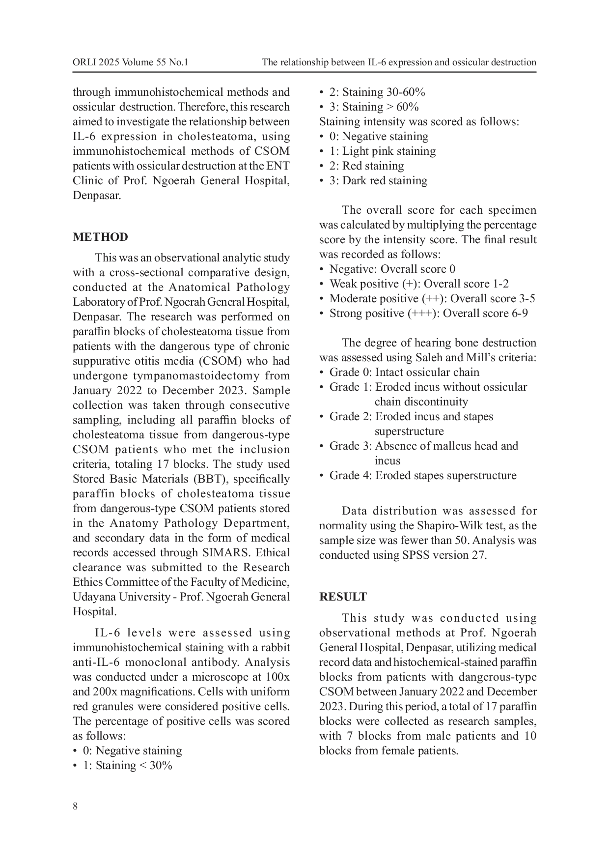 Penelitian ini menyimpulkan bahwa tidak terdapat hubungan yang signifikan antara ekspresi IL-6 dengan kerusakan tulang pendengaran akibat kolesteatoma pada pasien OMSK.Meskipun tidak ditemukan hubungan yang signifikan, penelitian ini menunjukkan bahwa pasien dengan kerusakan tulang pendengaran yang parah cenderung memiliki tingkat IL-6 yang lebih tinggi.IL-6 diduga terkait dengan patologi kerusakan tulang pendengaran yang terkait dengan kolesteatoma.