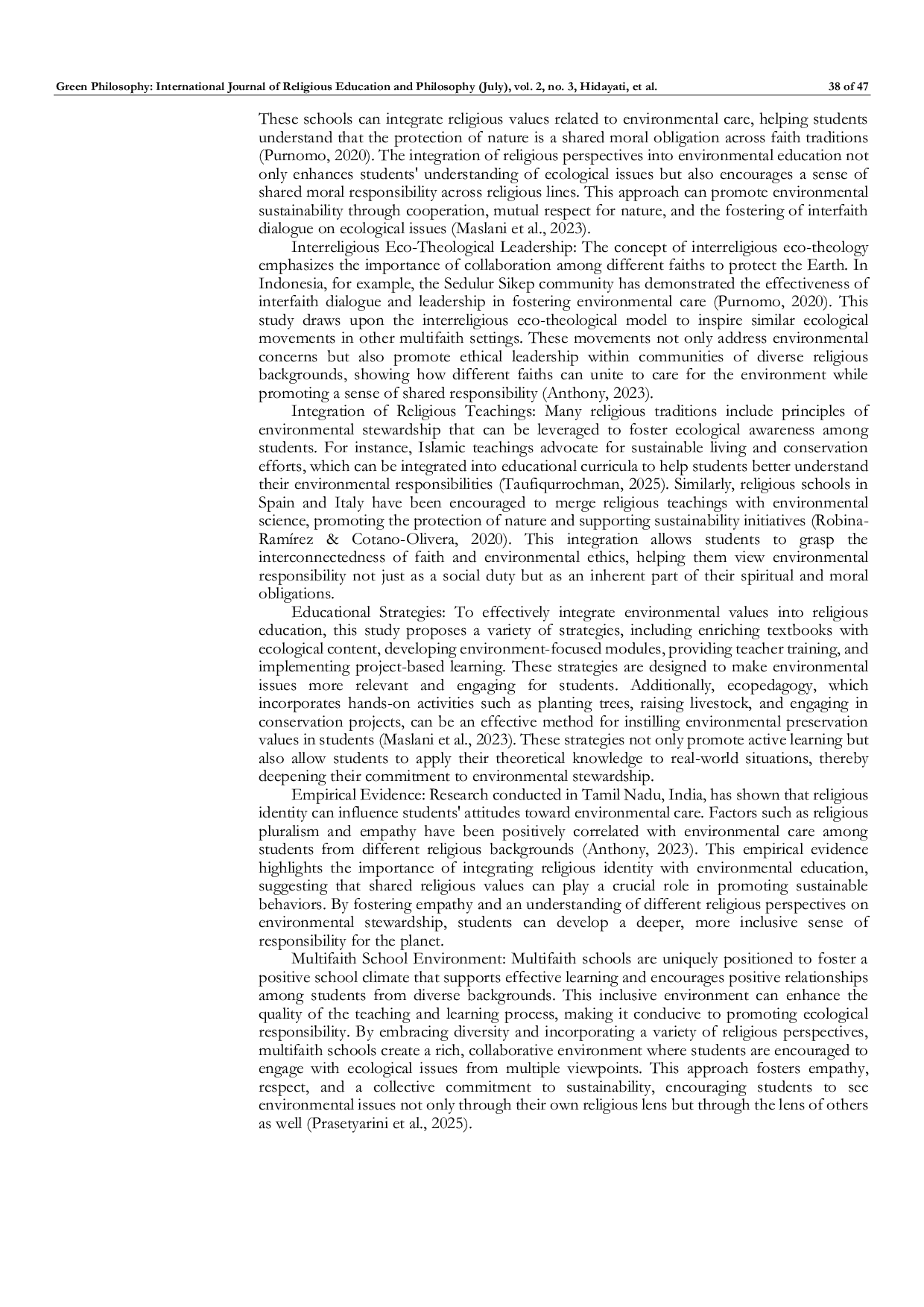 Green Philosophy: International Journal of Religious Education and PhilosophyGreen Philosophy: International Journal of Religious Education and PhilosophyKrisis lingkungan yang semakin meningkat menegaskan kebutuhan sistem pendidikan untuk menumbuhkan tanggung jawab ekologi di kalangan siswa. Penelitian ini mengeksplorasi potensi sekolah multifaith dalam mengembangkan pendidikan moral lingkungan melalui model pedagogik interreligius. Dengan mengintegrasikan ajaran keagamaan yang beragam tentang ekologi, model yang diusulkan bertujuan mempromosikan nilai moral bersama untuk perlindungan dan keberlanjutan lingkungan. Penelitian ini mengisi kesenjangan dalam pendidikan lingkungan yang seringkali tidak mengadopsi pendekatan terpadu yang melibatkan perspektif keagamaan. Melalui desain penelitian kualitatif, studi ini menganalisis kurikulum, mengamati praktik kelas, melakukan wawancara dengan pendidik, dan mengevaluasi kerangka pendidikan lingkungan yang ada di sekolah multifaith. Studi ini mengidentifikasi strategi utama, termasuk pengintegrasian eco‑ethics dari tradisi keagamaan berbeda, pembelajaran berbasis proyek, dan dialog antaragama, sebagai cara efektif menumbuhkan tanggung jawab ekologi. Namun, tantangan seperti menyeimbangkan perbedaan doktrinal, mengatasi bias, dan mengembangkan pedagogi inklusif tetap ada. Penelitian ini menekankan pentingnya merancang konten pendidikan yang menghormati semua agama dan memperkuat dialog antarbudaya, sehingga mendorong komitmen kolektif terhadap keberlanjutan. Temuan menunjukkan bahwa sekolah multifaith dapat menjadi platform kuat untuk pendidikan moral lingkungan, menyoroti nilai integrasi perspektif keagamaan dalam pendidikan keberlanjutan. Penelitian ini diakhiri dengan rekomendasi mengintegrasikan eco‑ethics interreligius ke dalam kurikulum dan program pelatihan guru serta menyarankan penelitian lanjutan mengenai dampak jangka panjang pendidikan lingkungan interreligius dan penerapannya dalam konteks budaya yang beragam.