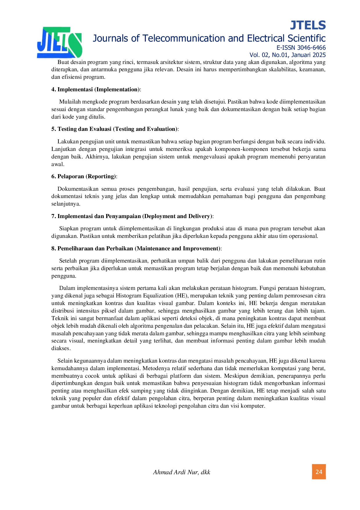 Journal of Telecommunication and Electrical ScientificJournal of Telecommunication and Electrical ScientificTeknologi pengenalan wajah telah menjadi topik penting dalam visi komputer dan kecerdasan buatan, dengan aplikasi di berbagai bidang seperti keamanan, pengawasan, dan interaksi manusia-mesin. Penelitian ini mengusulkan penggunaan Adaptive Histogram Equalization (AHE) untuk meningkatkan performa sistem deteksi dan pelacakan wajah berbasis realtime cascade classifier.