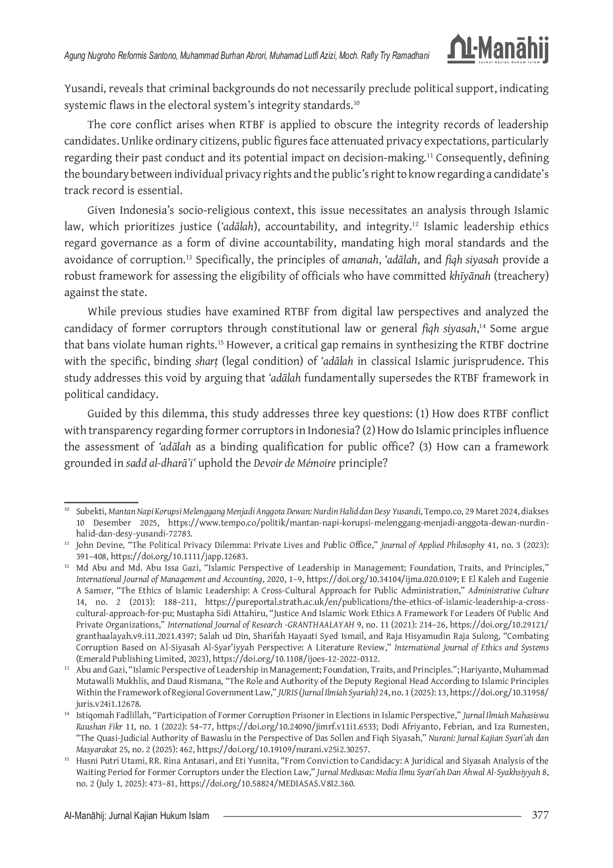 Al-Manahij: Jurnal Kajian Hukum IslamAl-Manahij: Jurnal Kajian Hukum IslamPeraturan Indonesia yang mengizinkan mantan narapidana korupsi untuk mencalonkan diri dalam jabatan publik setelah masa tunggu lima tahun menciptakan dilema normatif yang kritis, terutama ketika bersinggungan dengan Right to Be Forgotten (RTBF) yang berpusat di Uni Eropa. Artikel ini secara khusus bertujuan untuk menganalisis dan menantang penerapan kerangka RTBF pada pencalonan mantan koruptor dengan meninjaunya melalui lensa etika kepemimpinan Islam, yaitu prinsip amanah, adālah, dan fiqh siyasah. Dengan menggunakan pendekatan normatif-yuridis, penelitian ini menganalisis peraturan pemilu Indonesia dan doktrin RTBF, disintesis dengan yurisprudensi Islam klasik dan kontemporer, dengan fokus khusus pada Maqāshid al-Sharīʿah dan doktrin sadd al-dharāʿīʿ. Temuan mengungkapkan dua poin utama: pertama, masa tunggu lima tahun secara fundamental salah menerapkan RTBF dengan menyamakan catatan publik korupsi dengan data pribadi; artikel ini mengusulkan antitesisnya, devoir de mémoire (kewajiban untuk mengingat), sebagai kerangka kebijakan publik yang diperlukan. Kedua, yurisprudensi Islam menetapkan adālah (integritas moral) sebagai kualifikasi hukum yang mengikat (sharṭ) untuk jabatan publik, dan korupsi secara hukum dan permanen membatalkan kualifikasi ini. Penelitian menyimpulkan bahwa taubah spiritual berbeda dari kualifikasi publik (ḥaqq al-ummah) dan tidak secara otomatis memulihkan kelayakan, sehingga diskualifikasi mantan koruptor tidak melanggar hak melainkan merupakan implementasi yang diperlukan dari sadd al-dharāʿīʿ untuk melindungi amanah publik dan kepentingan umum.