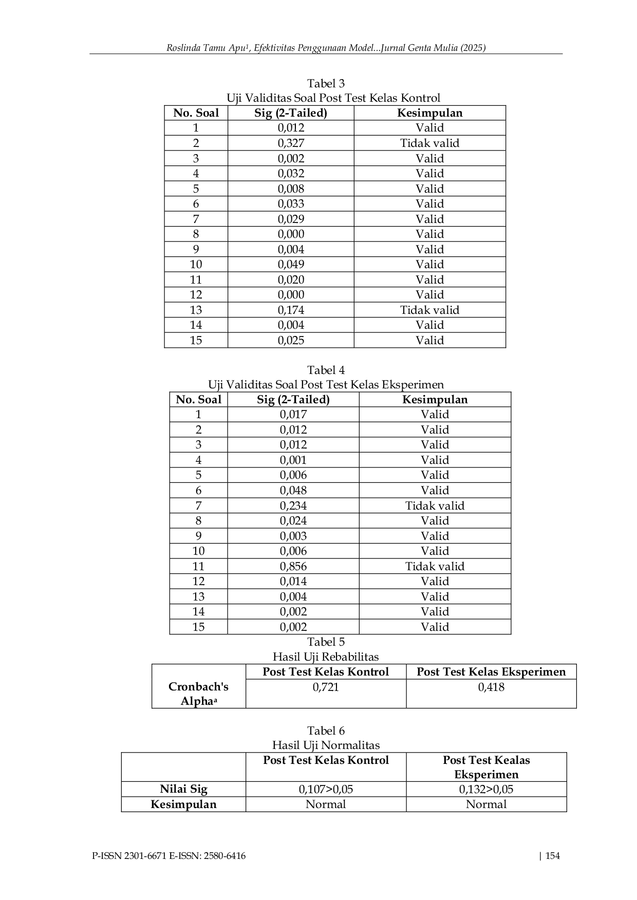 Jurnal Genta MuliaJurnal Genta MuliaPenelitian ini dilatarbelakangi oleh rendahnya hasil belajar siswa, kurangnya sumber belajar, dan media pembelajaran yang digunakan di dalam kelas tidak bervariasi. Hal ini menyebabkan respon siswa kurang aktif pada proses pembelajaran di kelas. Tujuan penelitian ini adalah untuk mengetahui apakah terdapat pengaruh model pembelajaran kooperatif tipe snowball throwing ber bantuan media leaflet terhadap hasil belajar siswa di SMA Negeri Matawai La Pawu. Penelitian ini menggunakan pendekatan kuantitatif dengan kelas eksperimen (X IPA-1) dan kelas kontrol (X IPA-2). Data dikumpulkan melalui tes dan dianalisis menggunakan SPSS, meliputi uji validitas, reliabilitas, deskriptif, normalitas, homogenitas, dan hipotesis sampel independen. Hasil menunjukkan rata-rata nilai posttest kelas eksperimen adalah 77,43, sedangkan kelas kontrol 69. Pengujian hipotesis menunjukkan pengaruh signifikan (Asymp Sig (2-tailed) = 0,001 < 0,05), sehingga penggunaan model pembelajaran kooperatif tipe snowball throwing berbantuan media leaflet berdampak positif pada hasil belajar siswa kelas X IPA-1 di SMA Negeri Matawai La Pawu.