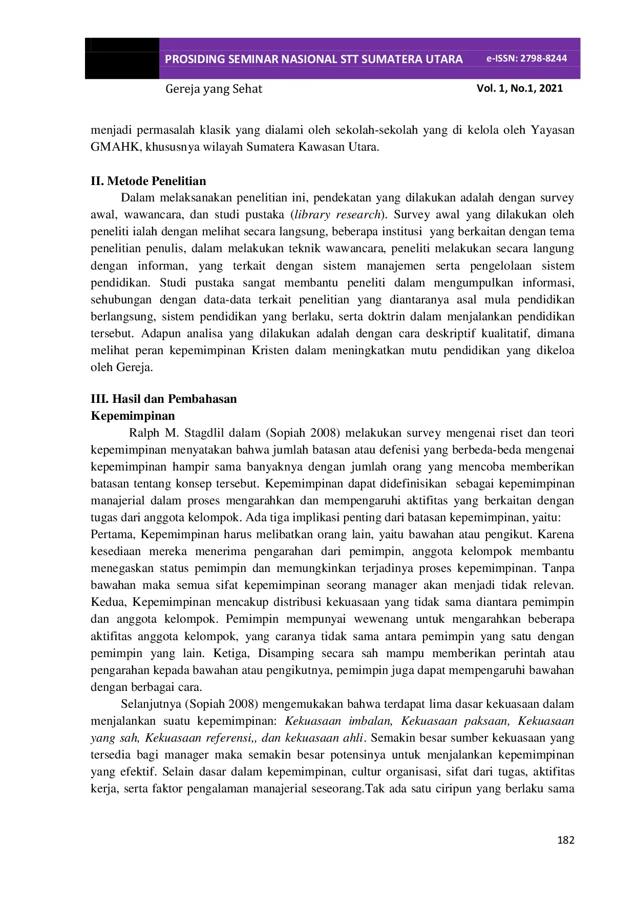 PROSIDING STT Sumatera UtaraPROSIDING STT Sumatera UtaraPeranan pendidikan merupakan suatu proses yang sangat penting dalam meningkatkan sumber daya manusia suatu bangsa. Keterbelakangan pendidikan suatu negara merupakan suatu hambatan serius dalam meningkatkan kesejahteraan suatu bangsa. Dalam mencerdaskan anak bangsa, peran swasta dibutuhkan dalam penyelenggaraan pendidikan. Peran swasta dalam hal ini pendidikan yang dikelola oleh Gereja Masehi Advent Hari Ketujuh, khususnya Wilayah Sumatera Utara, telah berkontribusi dalam menyelenggarakan pendidikan, namun belum secara maksimal dalam memberikan standar pendidikan yang berkualitas, hal ini dapat dilihat dengan melihat indikator, sarana prasarana yang kurang memadai, status akreditasi belum maksimal, serta belum menjadi pilihan utama peserta didik, khususnya di wilayah Sumatera Utara. Hal ini menjadi salah satu perhatian yang serius bagi pengelola institusi pendidikan di bawah Yayasan Pendidikan Advent. Dalam hal ini, Gereja memiliki peranan dalam meningkatkan mutu pendidikan melalui peran pemimpin yang Kristiani. Pemimpin yang Kristiani dipastikan akan dapat meningkatkan mutu pendidikan suatu Institusi khususnya yang dikelola oleh Gereja.