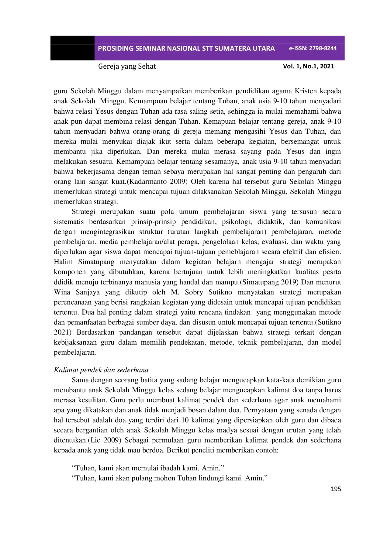 PROSIDING STT Sumatera UtaraPROSIDING STT Sumatera UtaraAnak Sekolah Minggu kelas madya adalah anak usia 9-11 tahun, artinya anak sudah mampu membaca dan memahami isi paragraf dan sudah mampu berkomunikasi dan berbicara di hadapan banyak orang. Dengan demikian, berdoa merupakan hal yang mudah dilakukan, tetapi pada faktanya tidak semua anak Sekolah Minggu madya mau berdoa. Anak Sekolah Minggu kelas madya adalah warga gereja yang memerlukan pembimbingan dalam mencapai kedewasaan iman. Salah satu wujud dari kedewasaan iman adalah kualitas doanya. Berdoa adalah berkomunikasi dengan Tuhan yang adalah Juru Selamat dan Kepala Gereja. Gereja yang sehat adalah gereja yang seluruh anggotanya memiliki komunikasi yang baik dengan kepala gerejanya, artinya penting bagi sebuah gereja memiliki anak-anak Sekolah Minggu kelas madya yang mau berdoa. Guru Sekolah Minggu perlu sebuah strategi untuk membimbing anak Sekolah Minggu kelas madya yang tidak mau berdoa, maka pada penulisan ini peneliti memberikan satu strategi bagi guru Sekolah Minggu membimbing anak Sekolah Minggu kelas madya yang tidak mau berdoa menjadi mau berdoa. Penelitian ini bertujuan untuk menggambarkan strategi yang diterapkan untuk menolong anak sekolah minggi kelas madya untuk mau berdoa. Dan untuk mencapai tujuan tersebut metode yang digunakan adalah kualitatif – deskriptif.