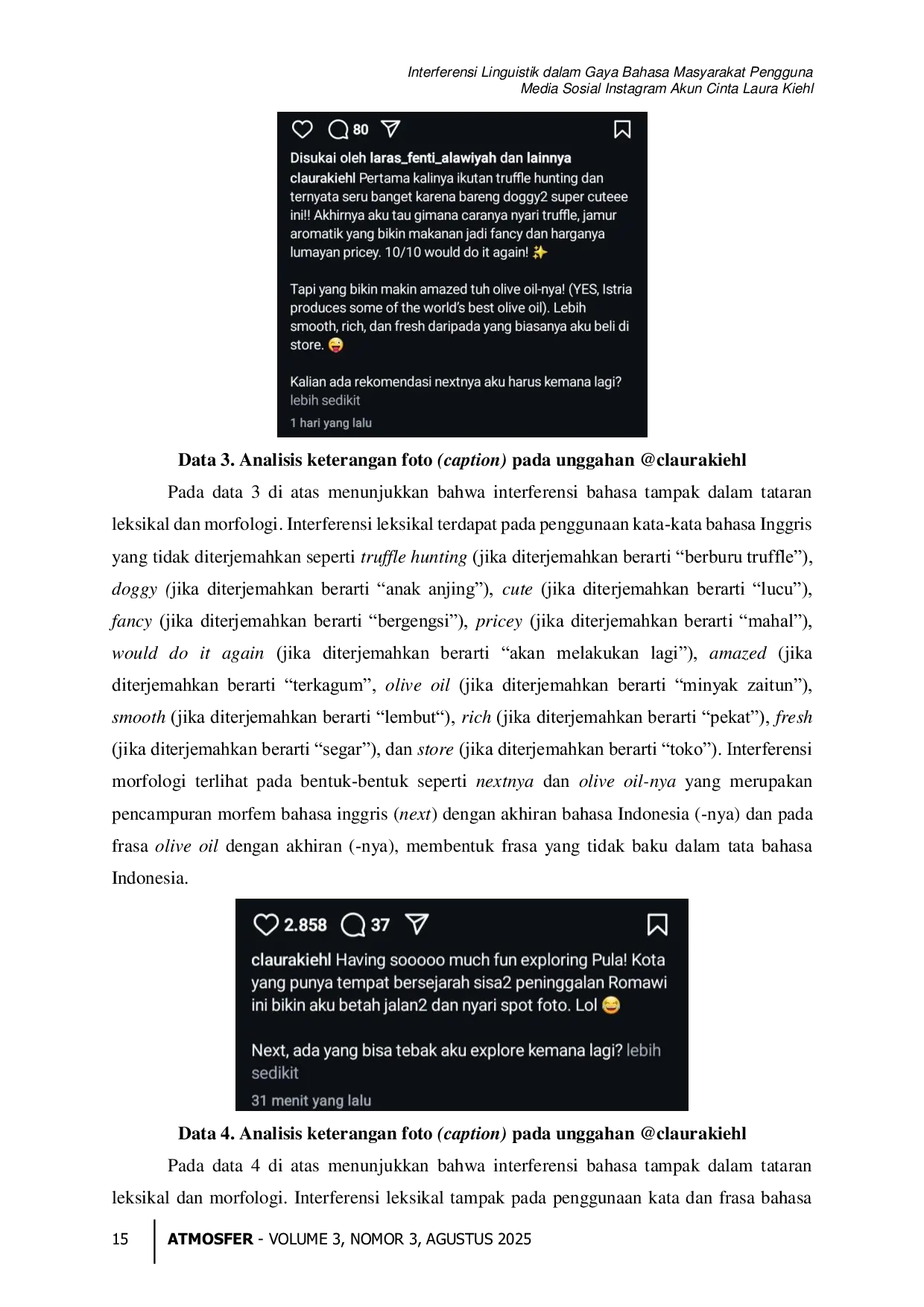 Atmosfer: Jurnal Pendidikan, Bahasa, Sastra, Seni, Budaya, dan Sosial HumanioraAtmosfer: Jurnal Pendidikan, Bahasa, Sastra, Seni, Budaya, dan Sosial HumanioraPenelitian ini membahas fenomena interferensi bahasa pada akun Instagram milik publik figur Cinta Laura Kiehl. Interferensi bahasa adalah sebuah fenomena bahasa ditandai dengan masuknya unsur-unsur dari satu bahasa ke bahasa lainnya biasa digunakan oleh penutur bilingual atau multilingual. Dalam konteks ini, interferensi bahasa Indonesia dan bahasa Inggris pada akun Instagram Cinta Laura menjadi menarik untuk ditelaah karena penggunaannya yang konsisten dan mencolok dalam berbagai unggahan maupun interaksi digitalnya. Penelitian ini menggunakan pendekatan deskriptif kualitatif dengan metode analisis isi terhadap data berupa keterangan gambar (caption) yang diunggah oleh Cinta Laura pada waktu tertentu. Hasil penelitian menunjukkan bahwa interferensi yang muncul dapat diklasifikasikan ke dalam beberapa tataran linguistik, yaitu tataran leksikal, morfologis, sintaksis, dan semantik. Interferensi leksikal tampak pada penggunaan kosakata bahasa Inggris dalam kalimat berbahasa Indonesia. Sementara itu, interferensi morfologis terlihat dari struktur pembentukan kata campuran yang tidak sesuai dengan kaidah dalam bahasa Indonesia. Interferensi sintaktis muncul dalam bentuk susunan kalimat yang mengikuti struktur bahasa Inggris. Faktor-faktor yang menjadi penyebab terjadinya interferensi di antaranya, latar belakang bilingualisme penutur, kebiasaan penggunaan bahasa asing dalam kehidupan sehari-hari, pengaruh lingkungan pergaulan internasional, serta gaya komunikasi yang bersifat ekspresif dan modern di media sosial. Penelitian ini menunjukkan bahwa interferensi dalam konteks media sosial bukan semata-mata bentuk penyimpangan bahasa, melainkan juga dapat dilihat sebagai bagian dari konstruksi identitas diri dan strategi komunikasi digital.