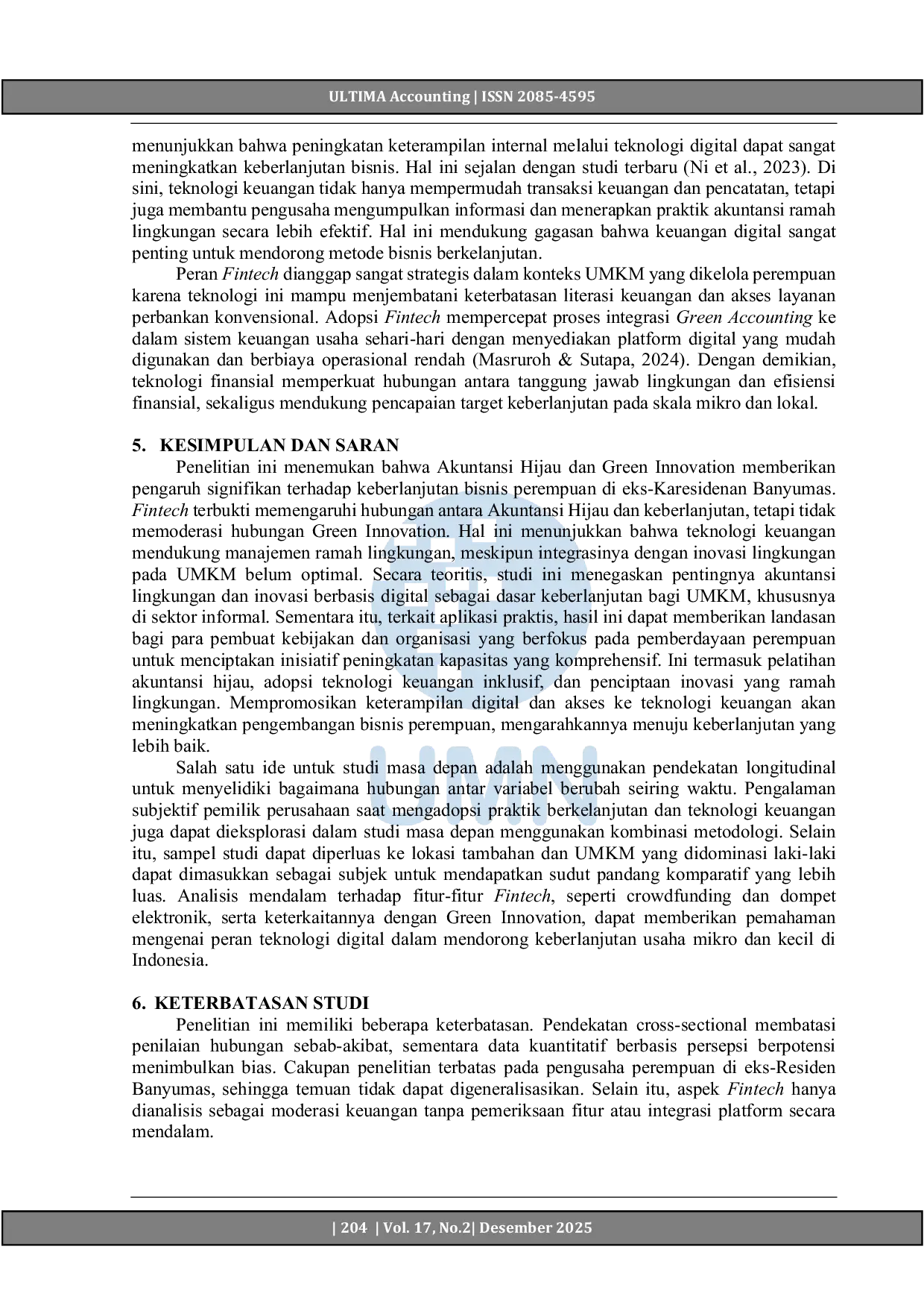 Studi lanjutan dapat menggunakan pendekatan longitudinal untuk memantau dinamika adopsi Green Innovation dan Fintech secara bertahap seiring waktu. Peneliti juga direkomendasikan membandingkan implementasi strategi keberlanjutan di UMKM milik pria dan perempuan di berbagai wilayah Indonesia. Selain itu, penelitian perlu menggali lebih mendalam bagaimana fitur khusus Fintech seperti crowdfunding dapat diintegrasikan untuk memperkuat inovasi lingkungan di usaha mikro.