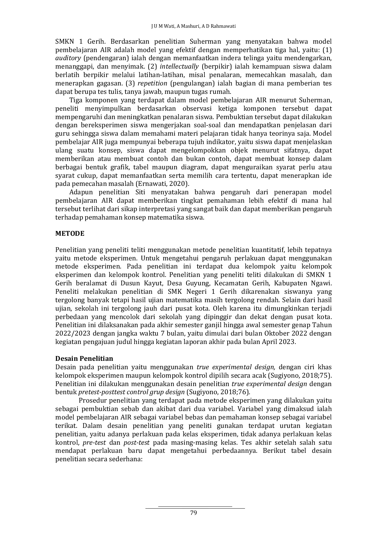 JURNAL JENDELA MATEMATIKAJURNAL JENDELA MATEMATIKAAbstrak: Tujuan dalam penelitian ini yaitu untuk mengetahui pemahaman konsep pada pelajaran matematika siswa kelas X SMKN 1 Gerih dengan menggunakan model pembelajaran Auditory Intellectually Repetition (AIR). Penelitian ini dilakukan menggunakan desain penelitian true experimental design dengan bentuk pretest-posttest control grup design. Penelitian yang peneliti teliti terdiri dari dua kelompok yang memiliki distribusi normal dan homogen. Pengujian hipotesis yang digunakan yaitu uji-t tidak berpasangan (independent). Kesimpulan dari hasil penelitian diantaranya yaitu (1) diperoleh perbedaan dan peningkatan pemahaman konsep matematika menggunakan model pembelajaran AIR dengan rerata 76,931 dan model pembelajaran konvensional mendapat rerata 69,793. (2) penerapan model pembelajaran AIR lebih baik terlihat dari (3) respon siswa positif dan kebanyakan setuju terhadap penerapan model pembelajaran AIR.