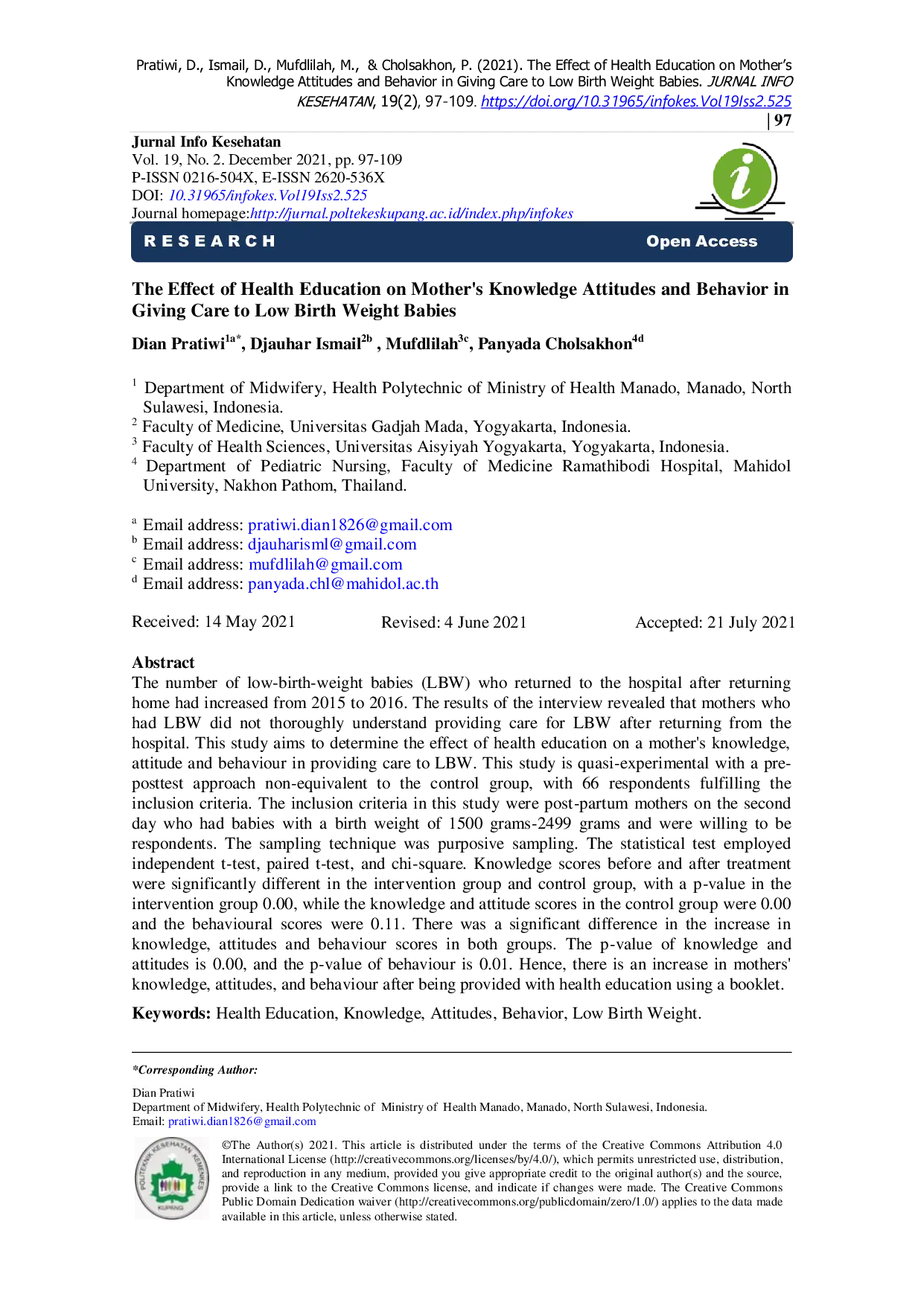 JURNAL INFO KESEHATANJURNAL INFO KESEHATANJumlah bayi berat lahir rendah (BBLR) yang kembali ke rumah sakit setelah pulang meningkat dari 2015 hingga 2016. Hasil wawancara menunjukkan bahwa ibu dengan BBLR tidak memahami secara menyeluruh tentang perawatan BBLR setelah pulang dari rumah sakit. Penelitian ini bertujuan untuk menentukan dampak pendidikan kesehatan terhadap pengetahuan, sikap, dan perilaku ibu dalam memberikan perawatan BBLR. Studi ini menggunakan pendekatan quasi-experimental pre-posttest non-equivalent control group dengan 66 responden. Hasil menunjukkan peningkatan signifikan pada skor pengetahuan, sikap, dan perilaku ibu setelah menerima pendidikan kesehatan menggunakan booklet.