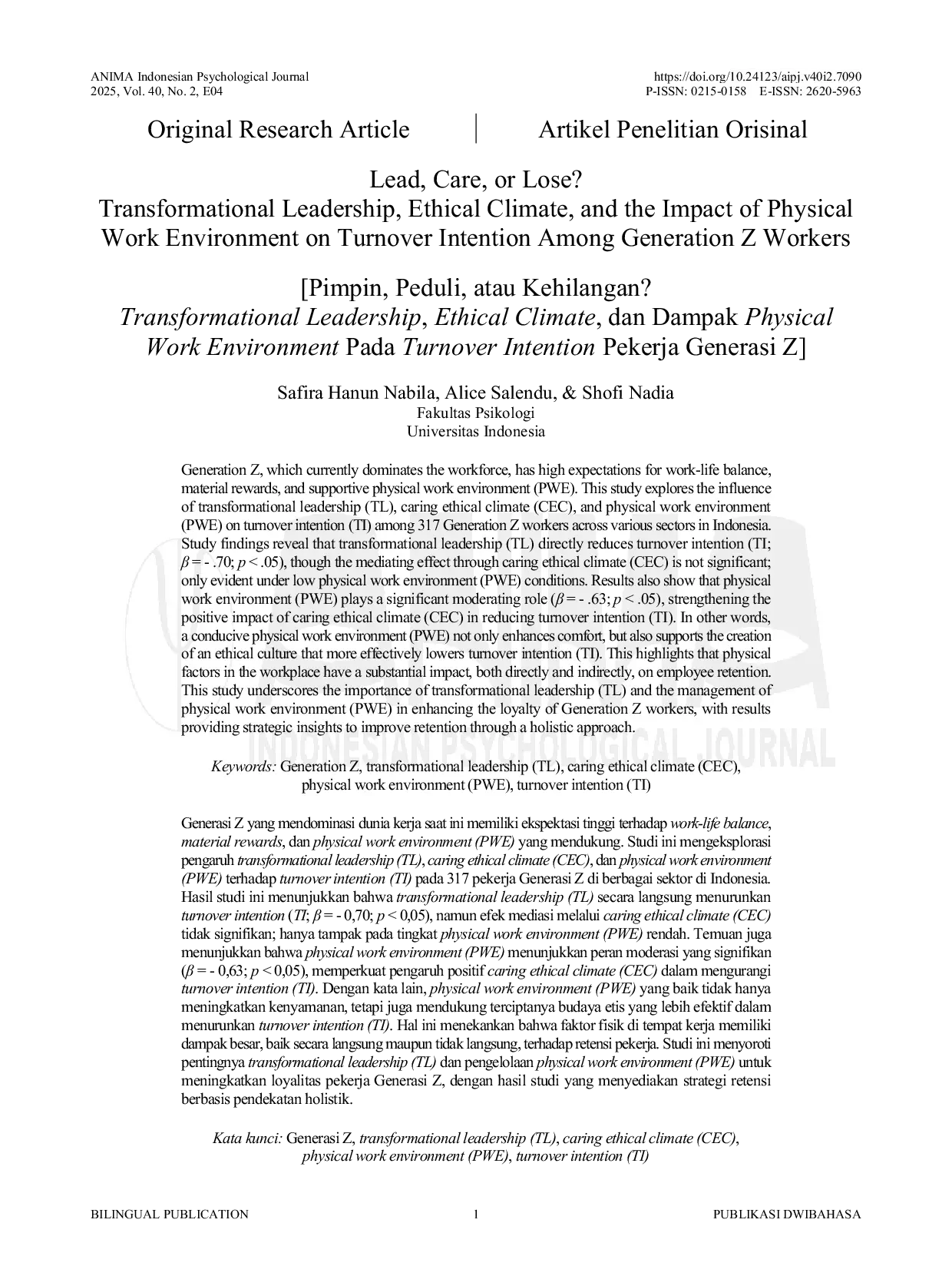 ANIMA Indonesian Psychological JournalANIMA Indonesian Psychological JournalGenerasi Z yang mendominasi dunia kerja saat ini memiliki ekspektasi tinggi terhadap work-life balance, material rewards, dan physical work environment (PWE) yang mendukung. Studi ini mengeksplorasi pengaruh transformational leadership (TL), caring ethical climate (CEC), dan physical work environment (PWE) terhadap turnover intention (TI) pada 317 pekerja Generasi Z di berbagai sektor di Indonesia. Hasil studi ini menunjukkan bahwa transformational leadership (TL) secara langsung menurunkan turnover intention (TI; β = - 0,70; p < 0,05), namun efek mediasi melalui caring ethical climate (CEC) tidak signifikan; hanya tampak pada tingkat physical work environment (PWE) rendah. Temuan juga menunjukkan bahwa physical work environment (PWE) menunjukkan peran moderasi yang signifikan (β = - 0,63; p < 0,05), memperkuat pengaruh positif caring ethical climate (CEC) dalam mengurangi turnover intention (TI). Dengan kata lain, physical work environment (PWE) yang baik tidak hanya meningkatkan kenyamanan, tetapi juga mendukung terciptanya budaya etis yang lebih efektif dalam menurunkan turnover intention (TI). Hal ini menekankan bahwa faktor fisik di tempat kerja memiliki dampak besar, baik secara langsung maupun tidak langsung, terhadap retensi pekerja. Studi ini menyoroti pentingnya transformational leadership (TL) dan pengelolaan physical work environment (PWE) untuk meningkatkan loyalitas pekerja Generasi Z, dengan hasil studi yang menyediakan strategi retensi berbasis pendekatan holistik.