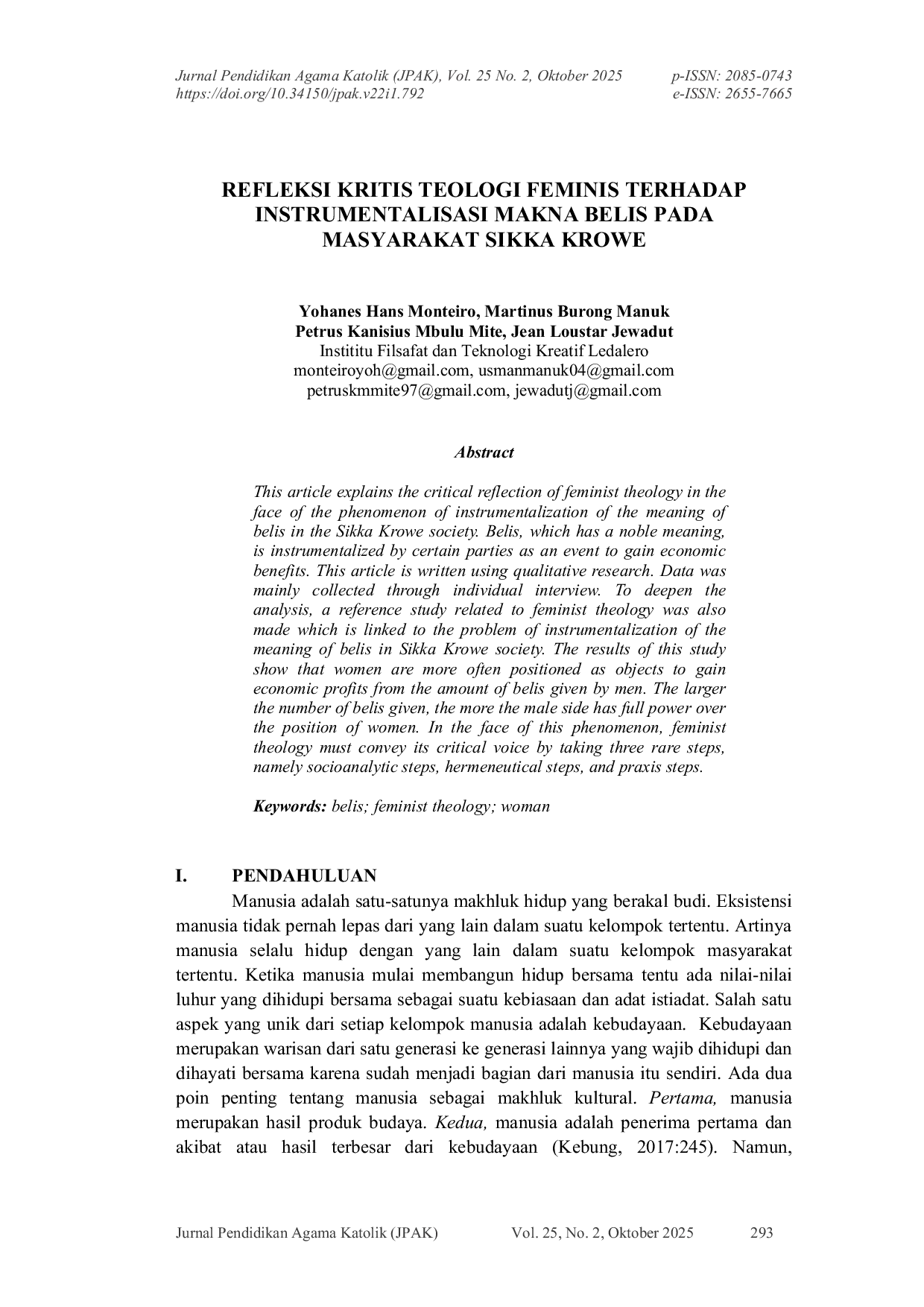 JPAK: Jurnal Pendidikan Agama KatolikJPAK: Jurnal Pendidikan Agama KatolikArtikel ini menguraikan refleksi kritis teologi feminis terhadap fenomena instrumentalisasi makna belis dalam masyarakat Sikka Krowe. Belis, yang sejatinya memiliki makna luhur, diinstrumentalisasi oleh pihak tertentu sebagai sarana untuk memperoleh keuntungan ekonomis. Penelitian ini ditulis menggunakan metode kualitatif. Data utama dikumpulkan melalui wawancara individual. Untuk memperdalam analisis, studi referensi terkait teologi feminis juga dilakukan, yang dihubungkan dengan permasalahan instrumentalisasi makna belis di masyarakat Sikka Krowe. Hasil penelitian ini menunjukkan bahwa perempuan lebih sering diposisikan sebagai objek untuk meraup keuntungan ekonomis dari jumlah belis yang diberikan oleh laki-laki. Semakin besar jumlah belis yang diberikan, semakin besar pula kekuasaan pihak laki-laki atas posisi perempuan. Dalam menghadapi fenomena ini, teologi feminis harus menyuarakan kritik dengan mengambil tiga langkah utama, yaitu langkah sosioanalitik, hermeneutis, dan praksis.