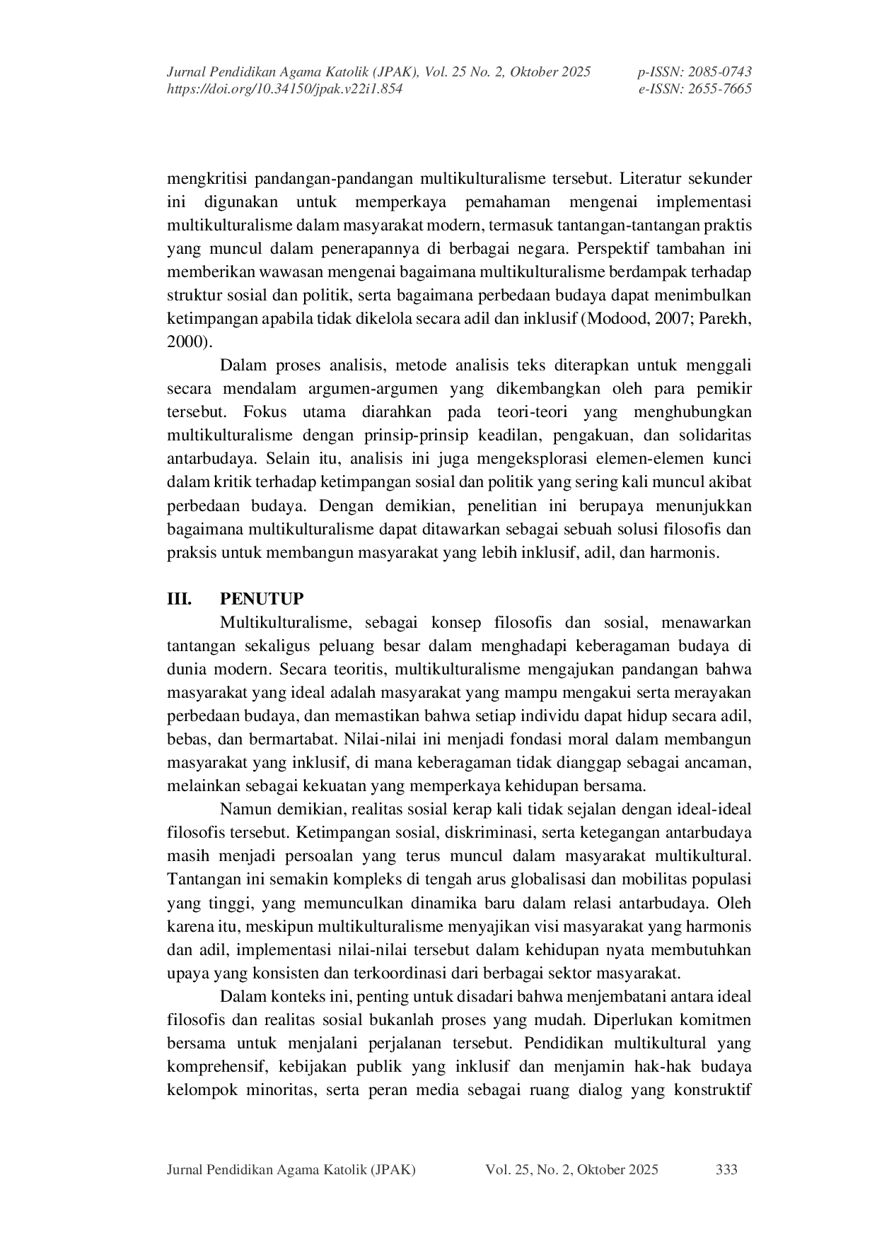 JPAK: Jurnal Pendidikan Agama KatolikJPAK: Jurnal Pendidikan Agama KatolikMulticulturalism is a philosophical and social concept that emphasizes the recognition of cultural diversity, advocating for principles of justice, equality, and respect for differing cultural identities. While the ideal of multiculturalism is widely accepted in theory, its application in social practice often faces significant challenges, such as social inequality, discrimination, and inter-cultural tensions. This study examines the relationship between the philosophical ideal of multiculturalism and the social realities faced by contemporary multicultural societies. It argues that the gap between theoretical frameworks and real-world practices can be bridged through critical dialogue, a commitment to inclusive policies, multicultural education, and the active role of media in fostering inter-cultural understanding. The research also underscores the importance of collective awareness within society regarding diversity as a vital social resource for promoting social cohesion and justice. By analyzing these dimensions, the study demonstrates how multiculturalism, when effectively implemented, can transcend its theoretical aspirations and become a transformative force in creating just and harmonious societies. Overall, this research aims to provide insights into how societies can bridge cultural differences, not only through policies but by fostering mutual respect and shared values in everyday life.