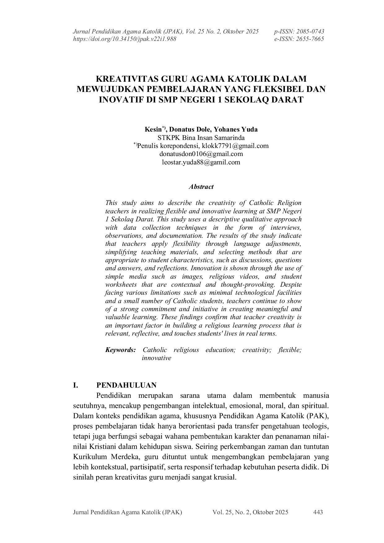 JPAK: Jurnal Pendidikan Agama KatolikJPAK: Jurnal Pendidikan Agama KatolikPendidikan merupakan sarana utama dalam membentuk manusia seutuhnya, mencakup pengembangan intelektual, emosional, moral, dan spiritual. Dalam konteks pendidikan agama, khususnya Pendidikan Agama Katolik (PAK), proses pembelajaran tidak hanya berorientasi pada transfer pengetahuan teologis, tetapi juga berfungsi sebagai wahana pembentukan karakter dan penanaman nilai-nilai Kristiani dalam kehidupan siswa. Seiring perkembangan zaman dan tuntutan Kurikulum Merdeka, guru dituntut untuk mengembangkan pembelajaran yang lebih kontekstual, partisipatif, serta responsif terhadap kebutuhan peserta didik. Di sinilah peran kreativitas guru menjadi sangat krusial.