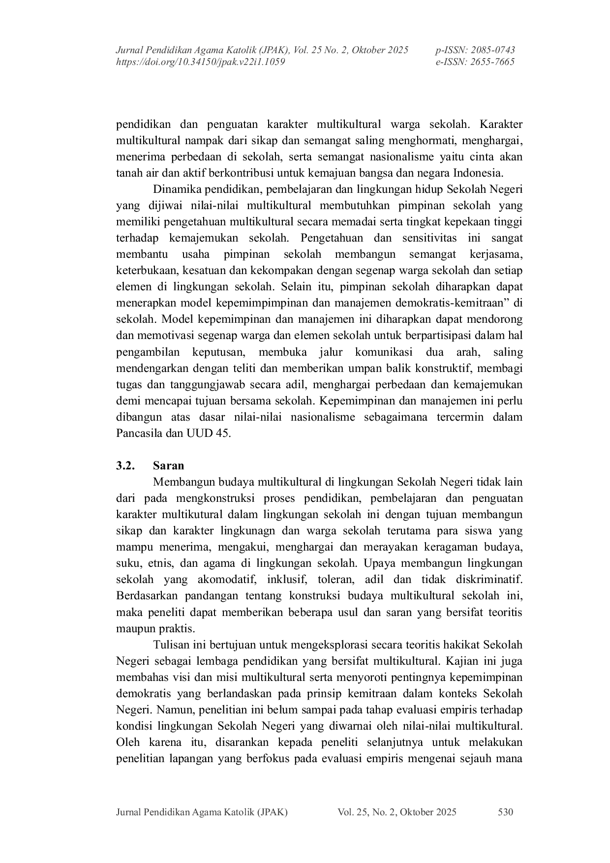 Sekolah negeri merupakan sekolah yang sangat kaya akan pengalaman budaya, nilai-nilai, adat istiadat, dan kebiasaan dari berbagai suku, agama, etnis, kelompok sosial, dan budaya masyarakat Indonesia.Salah satu tugas dan panggilan sekolah negeri adalah mengintegrasikan nilai-nilai multikultural dalam visi, misi, dan kebijakan kurikulumnya untuk membangun karakter multikultural warga sekolah.Karakter multikultural ini tercermin dari sikap saling menghormati, menghargai, dan menerima perbedaan di sekolah, serta semangat nasionalisme.Dinamika pendidikan dan lingkungan hidup sekolah negeri yang dijiwai nilai-nilai multikultural membutuhkan pimpinan sekolah yang memiliki pengetahuan multikultural yang memadai dan tingkat kepekaan tinggi terhadap kemajemukan sekolah.Pimpinan sekolah diharapkan dapat menerapkan model kepemimpinan dan manajemen demokratis-kemitraan untuk mendorong partisipasi warga sekolah dalam pengambilan keputusan, komunikasi dua arah, dan kerja sama dalam mencapai tujuan bersama.