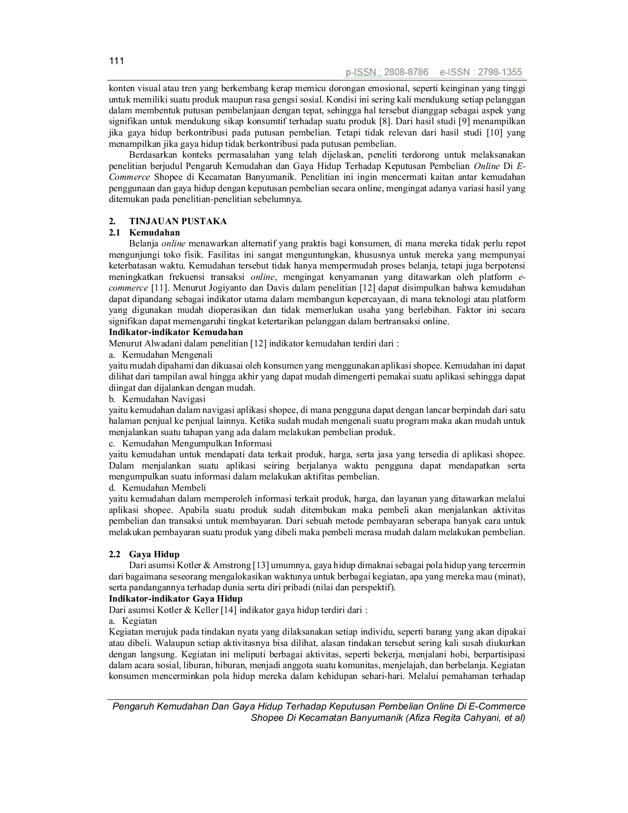Penelitian ini menyimpulkan bahwa kemudahan dan gaya hidup secara parsial berpengaruh signifikan terhadap keputusan pembelian di e-commerce Shopee.Selain itu, secara simultan, kedua variabel bebas tersebut juga berkontribusi signifikan terhadap variabel terikat.Temuan ini menegaskan pentingnya kemudahan penggunaan platform dan gaya hidup konsumen dalam mempengaruhi keputusan pembelian online, sehingga platform e-commerce perlu mengoptimalkan aspek-aspek tersebut untuk meningkatkan loyalitas konsumen dan daya saing.