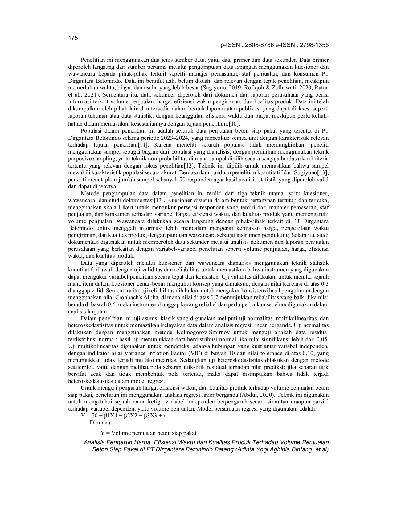 Dinamika: Jurnal Manajemen Sosial EkonomiDinamika: Jurnal Manajemen Sosial EkonomiPenelitian ini menganalisis pengaruh harga, efisiensi waktu, dan kualitas produk terhadap volume penjualan beton siap pakai di PT Dirgantara Betonindo Batang. Metode penelitian yang digunakan adalah kuantitatif dengan pendekatan kausal, data dikumpulkan melalui kuesioner, wawancara, serta studi dokumentasi. Sampel penelitian ini terdiri dari 70 responden yang dipilih menggunakan teknik purposive sampling. Hasil analisis regresi liner berganda menunjukkan bahwa efisiensi waktu dan kualitas produk berpengaruh signifikan terhadap volume penjualan, sedangkan harga berpengaruh positif namun tidak signifikan. Model regresi dapat menjelaskan 72,2% variasi volume penjualan. Temuan ini memberikan rekomendasi strategis bagi manajemen perusahaan dalam meningkatkan efisiensi dan kualitas untuk mendorong penjualan.