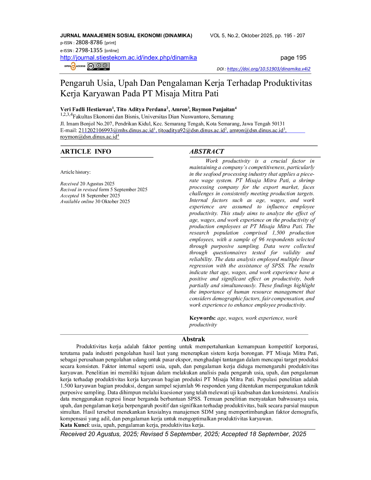 Dinamika: Jurnal Manajemen Sosial EkonomiDinamika: Jurnal Manajemen Sosial EkonomiProduktivitas kerja adalah faktor penting untuk mempertahankan kemampuan kompetitif korporasi, terutama pada industri pengolahan hasil laut yang menerapkan sistem kerja borongan. PT Misaja Mitra Pati, sebagai perusahaan pengolahan udang untuk pasar ekspor, menghadapi tantangan dalam mencapai target produksi secara konsisten. Faktor internal seperti usia, upah, dan pengalaman kerja diduga memengaruhi produktivitas karyawan. Penelitian ini memiliki tujuan dalam melakukan analisis pada pengaruh usia, upah, dan pengalaman kerja terhadap produktivitas kerja karyawan bagian produksi PT Misaja Mitra Pati. Populasi penelitian adalah 1.500 karyawan bagian produksi, dengan sampel sejumlah 96 responden yang ditentukan menggunakan teknik purposive sampling. Data dihimpun melalui kuesioner yang telah melewati uji keabsahan dan konsistensi. Analisis data menggunakan regresi linear berganda berbantuan SPSS. Temuan penelitian menyatakan bahwa usia, upah, dan pengalaman kerja berpengaruh positif dan signifikan terhadap produktivitas, baik secara parsial maupun simultan. Hasil tersebut menekankan krusialnya manajemen SDM yang mempertimbangkan faktor demografis, kompensasi yang adil, dan pengalaman kerja untuk mengoptimalkan produktivitas karyawan.