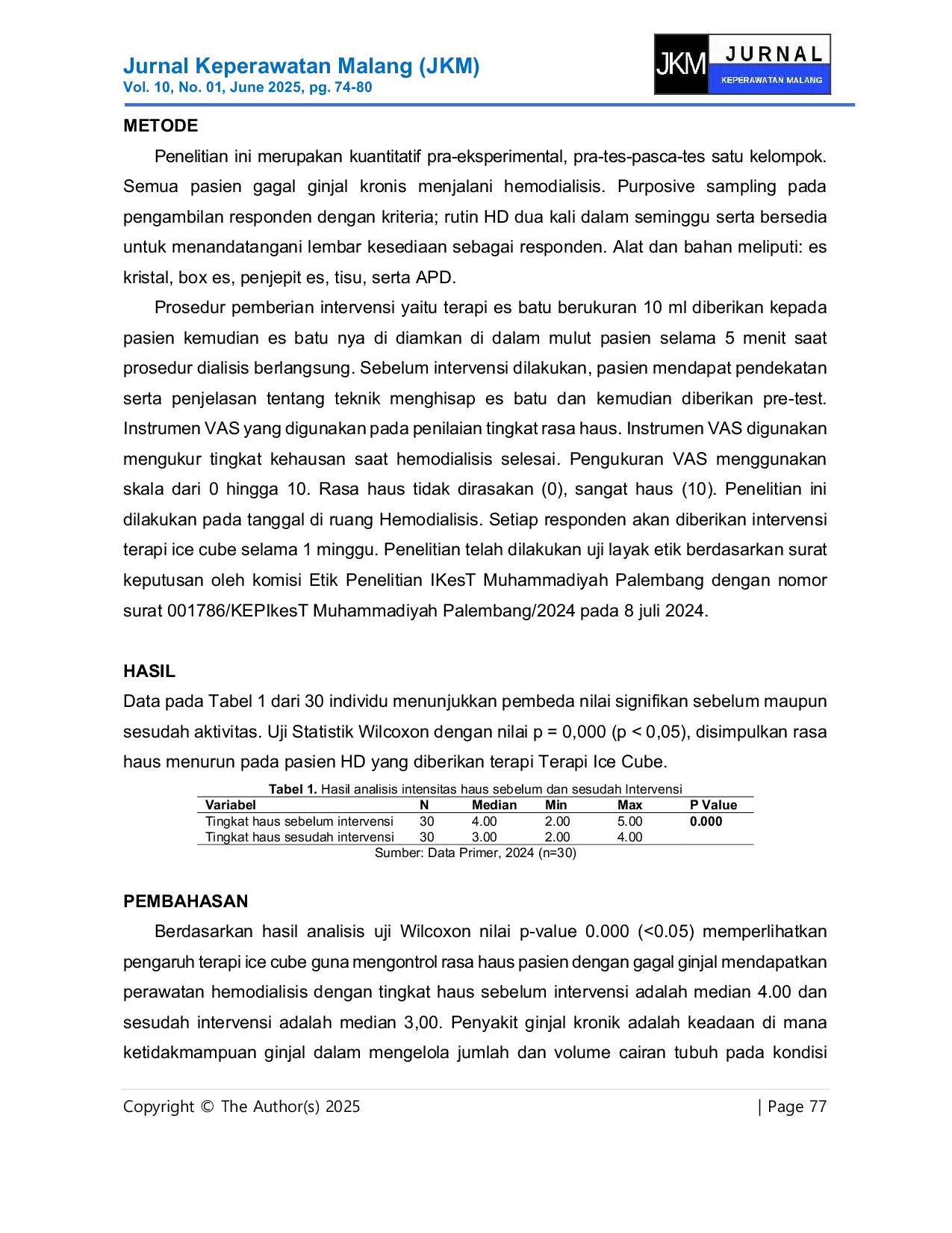 Jurnal Keperawatan MalangJurnal Keperawatan MalangLatar belakang: Penyakit gagal ginjal kronik (GGK) bersifat menetap dan tidak dapat disembuhkan, memerlukan tindakan pengobatan jangka panjang seperti hemodialisis. Rasa haus menjadi masalah penting yang perlu diintervensi, dan terapi ice cubes merupakan salah satu upaya yang dapat dilakukan. Tujuan penelitian ini adalah untuk mengetahui pengaruh terapi ice cube terhadap penurunan intensitas asupan cairan pada pasien gagal ginjal kronik dengan proses hemodialisis. Metode penelitian kuantitatif pra-eksperimen menggunakan desain one-group pretest-posttest dengan 30 responden. Pasien diberikan 10 cc es batu untuk dihisap selama 5 menit sebagai terapi, dan VAS digunakan untuk pengukuran. Hasil penelitian menunjukkan bahwa terapi es batu mengurangi konsumsi cairan pada pasien gagal ginjal yang menjalani hemodialisis dengan tingkat rasa haus rata-rata 3,53 sebelum intervensi dan 3,10 setelah intervensi (p=0,000). Penelitian ini menemukan bahwa terapi es batu dapat mengurangi rasa haus pada pasien hemodialisis dengan gagal ginjal, sehingga rasa haus pasien dapat distabilkan. Peneliti diharapkan untuk menambahkan variabel serta kelompok kontrol dalam penelitian berikutnya.