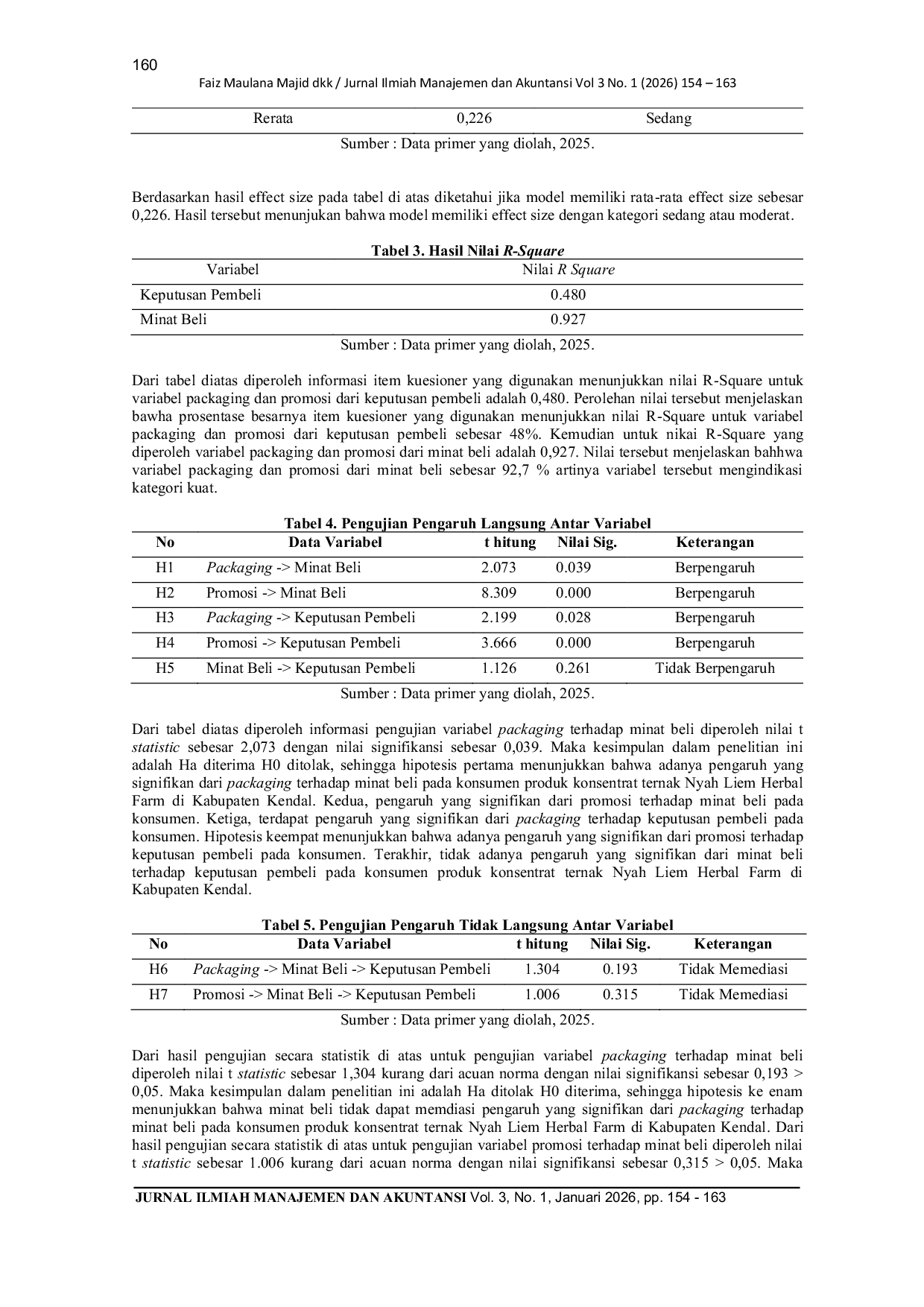Jurnal Ilmiah Manajemen dan AkuntansiJurnal Ilmiah Manajemen dan AkuntansiPenelitian ini bertujuan menganalisis . Dilatarbelakangi keputusan pembelian suatu produk dipengaruhi oleh beberapa faktor diantaranya yaitu produk, promosi, kemasan dan strategi pemasaran. Riset ini berfokus untuk menelaah minat beli dan keputusan pembeli produk konsentrat pakan Nyah Liem Herbal dari jamu-jamuan rembah. Penelitian ini menggunakan penelitian kuantitatif, yang bersifat kausal atau asosiatif. Teknik sampling yang digunakan adalah total sampling seluruh konsumen yang memberli produk konsentrat Nyah Liem Herbal d sejumlah 38 orang. Teknik pengumpulan data dalam penelitian ini menggunakan angket kuesioner. Analisa data menggunakan uji instrumen, uji prasyarat dan uji hipotesis menggunakan bantuan aplikasi SmartPLS. Hasil riset menunjukan nilai Goodnes of fit index sebesar 0,698 atau lebih besar dari nilai norma 0,36 sebagaimana kriteria nilai GoF tergolong besar. Persentase besarnya item kuesioner yang digunakan menunjukkan nilai R-Square untuk variabel packaging dan promosi dari keputusan pembeli sebesar 48%. Packaging dan promosi dari minat beli sebesar 92,7%. Model memiliki rata-rata effect size sebesar 0,226, hasil tersebut menunjukan bahwa model memiliki effect size dengan kategori sedang atau moderat. Kesimpulan yaitu (1) terdapat pengaruh packaging dan promosi terhadap minat beli dan keputusan pembeli. (2) tidak adanya pengaruh yang signifikan dari minat beli terhadap keputusan pembeli, (3) minat beli tidak dapat memdiasi pengaruh dari promosi dan packaging terhadap keputusan pembeli pada konsumen produk konsentrat ternak Nyah Liem Herbal Farm di Kabupaten Kendal. Bagi Peneliti Selanjutnya, diharapkan pada riset selanjutnya untuk menambahkan beberapa faktor yang mempengaruhi keputusan pembeli.