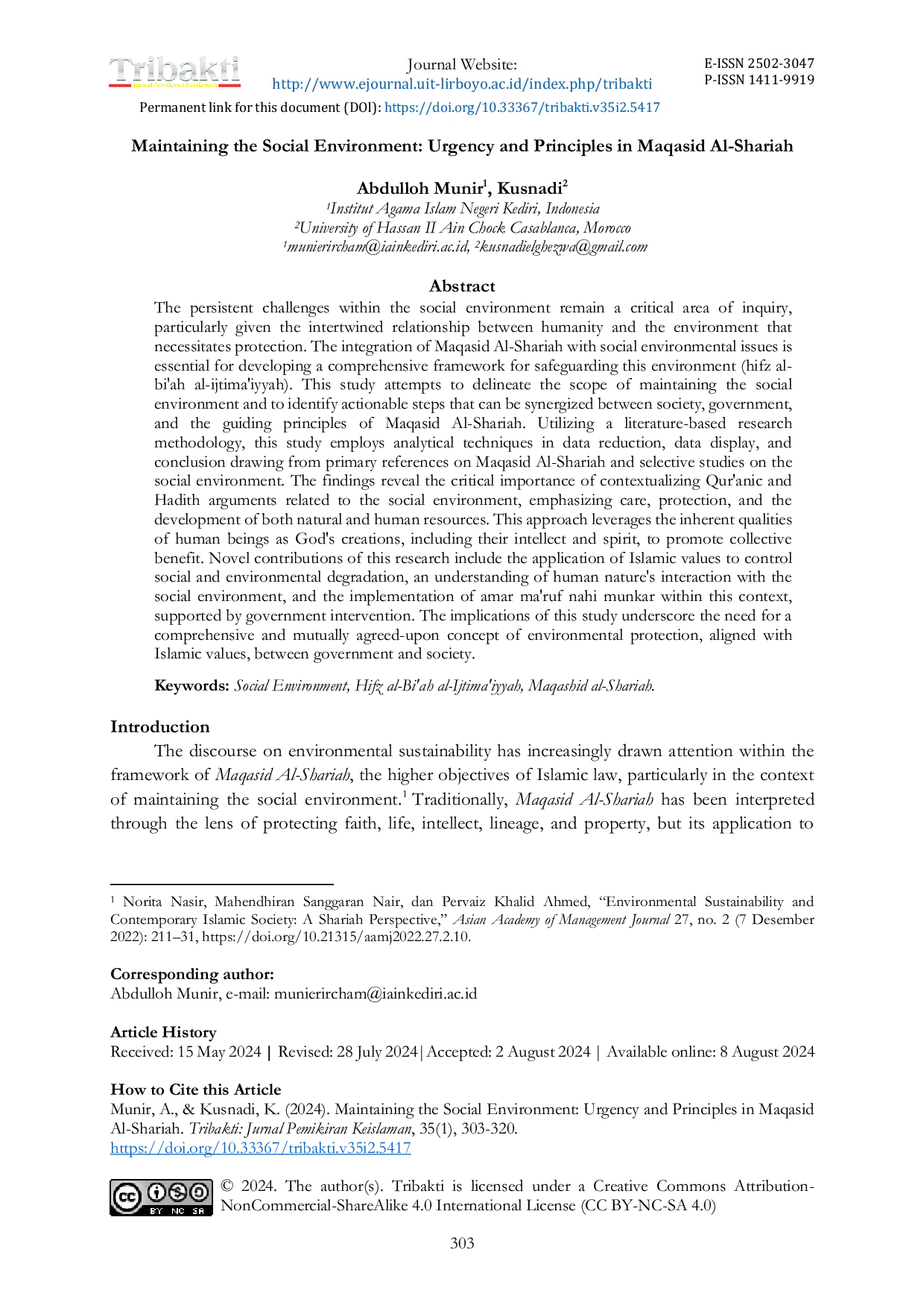 Tribakti: Jurnal Pemikiran KeislamanTribakti: Jurnal Pemikiran KeislamanTantangan yang berkelanjutan dalam lingkungan sosial tetap menjadi bidang penelitian yang kritis, terutama mengingat hubungan saling terkait antara manusia dan lingkungan yang memerlukan perlindungan. Integrasi Maqasid Al-Shariah dengan isu-isu lingkungan sosial sangat penting untuk mengembangkan kerangka kerja komprehensif untuk menjaga lingkungan ini (hifz al-biah al-ijtimaiyyah). Penelitian ini berusaha mendefinisikan lingkup pemeliharaan lingkungan sosial dan mengidentifikasi langkah-langkah yang dapat disinergikan antara masyarakat, pemerintah, dan prinsip-prinsip Maqasid Al-Shariah. Dengan menggunakan metodologi penelitian berbasis literatur, penelitian ini menggunakan teknik analitis dalam pengurangan data, tampilan data, dan penarikan kesimpulan dari referensi primer tentang Maqasid Al-Shariah dan studi terpilih tentang lingkungan sosial. Temuan mengungkapkan pentingnya yang sangat penting dalam mengkontekstualkan argumen Alquran dan Hadis yang berkaitan dengan lingkungan sosial, menekankan perawatan, perlindungan, dan pengembangan sumber daya alam dan manusia. Pendekatan ini memanfaatkan kualitas bawaan manusia sebagai ciptaan Tuhan, termasuk kecerdasan dan roh mereka, untuk mempromosikan manfaat kolektif.