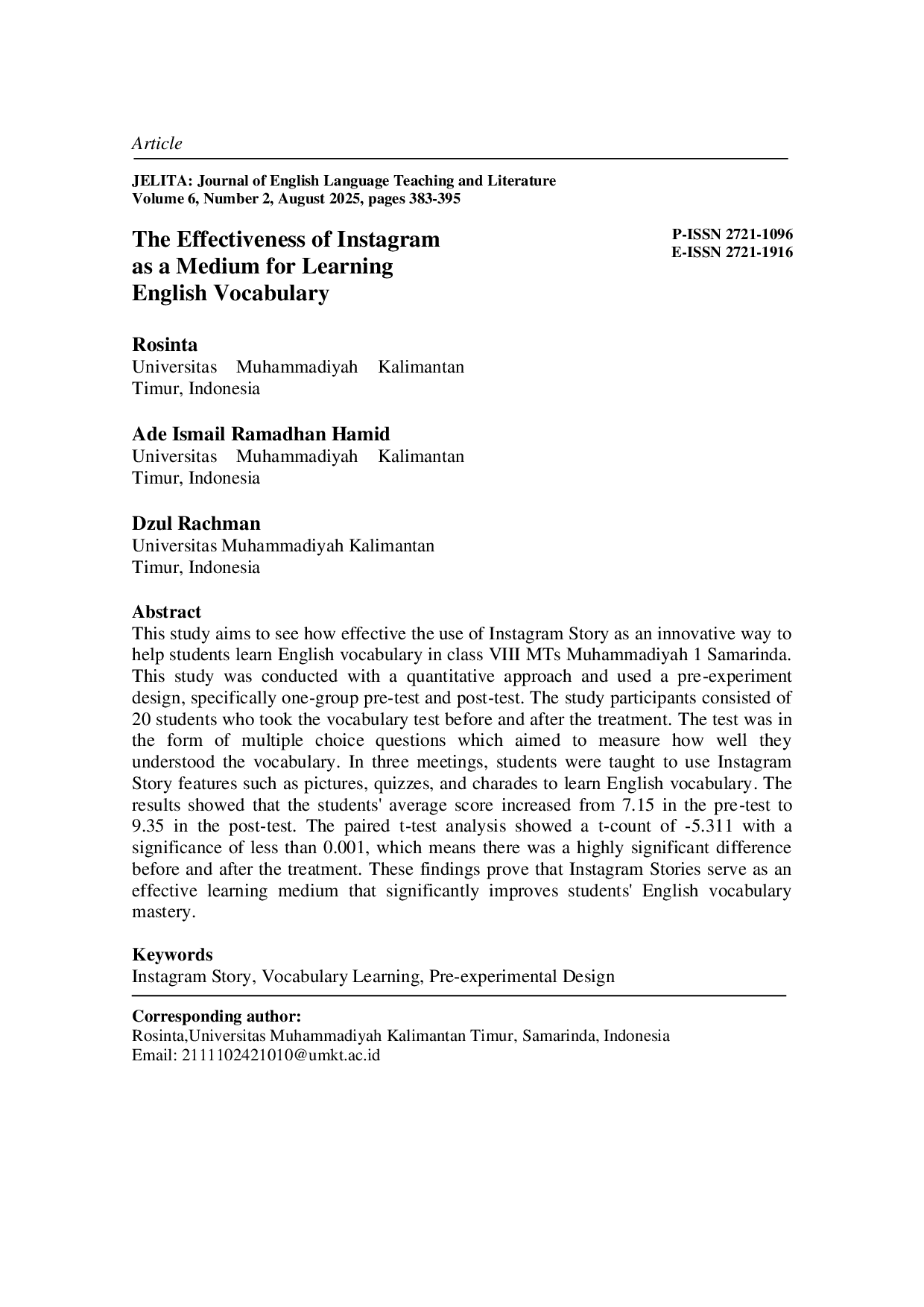 JELITAJELITAPenelitian ini bertujuan untuk melihat seberapa efektif penggunaan Instagram Story sebagai cara inovatif untuk membantu siswa belajar kosakata bahasa Inggris di kelas VIII MTs Muhammadiyah 1 Samarinda. Penelitian ini dilakukan dengan pendekatan kuantitatif dan menggunakan desain pre-eksperimen, yaitu pre-test dan post-test satu kelompok. Peserta penelitian terdiri dari 20 siswa yang mengikuti tes kosakata sebelum dan setelah perlakuan. Tes ini berupa soal pilihan ganda yang bertujuan mengukur pemahaman mereka terhadap kosakata. Dalam tiga pertemuan, siswa diajarkan untuk menggunakan fitur Instagram Story seperti gambar, kuis, dan charades untuk belajar kosakata bahasa Inggris. Hasilnya menunjukkan bahwa skor rata-rata siswa meningkat dari 7,15 pada pre-test menjadi 9,35 pada post-test. Analisis paired t-test menunjukkan nilai t-count sebesar -5,311 dengan signifikansi kurang dari 0,001, yang berarti terdapat perbedaan yang sangat signifikan sebelum dan setelah perlakuan. Temuan ini membuktikan bahwa Instagram Stories berfungsi sebagai media belajar yang efektif yang secara signifikan meningkatkan penguasaan kosakata bahasa Inggris siswa.
