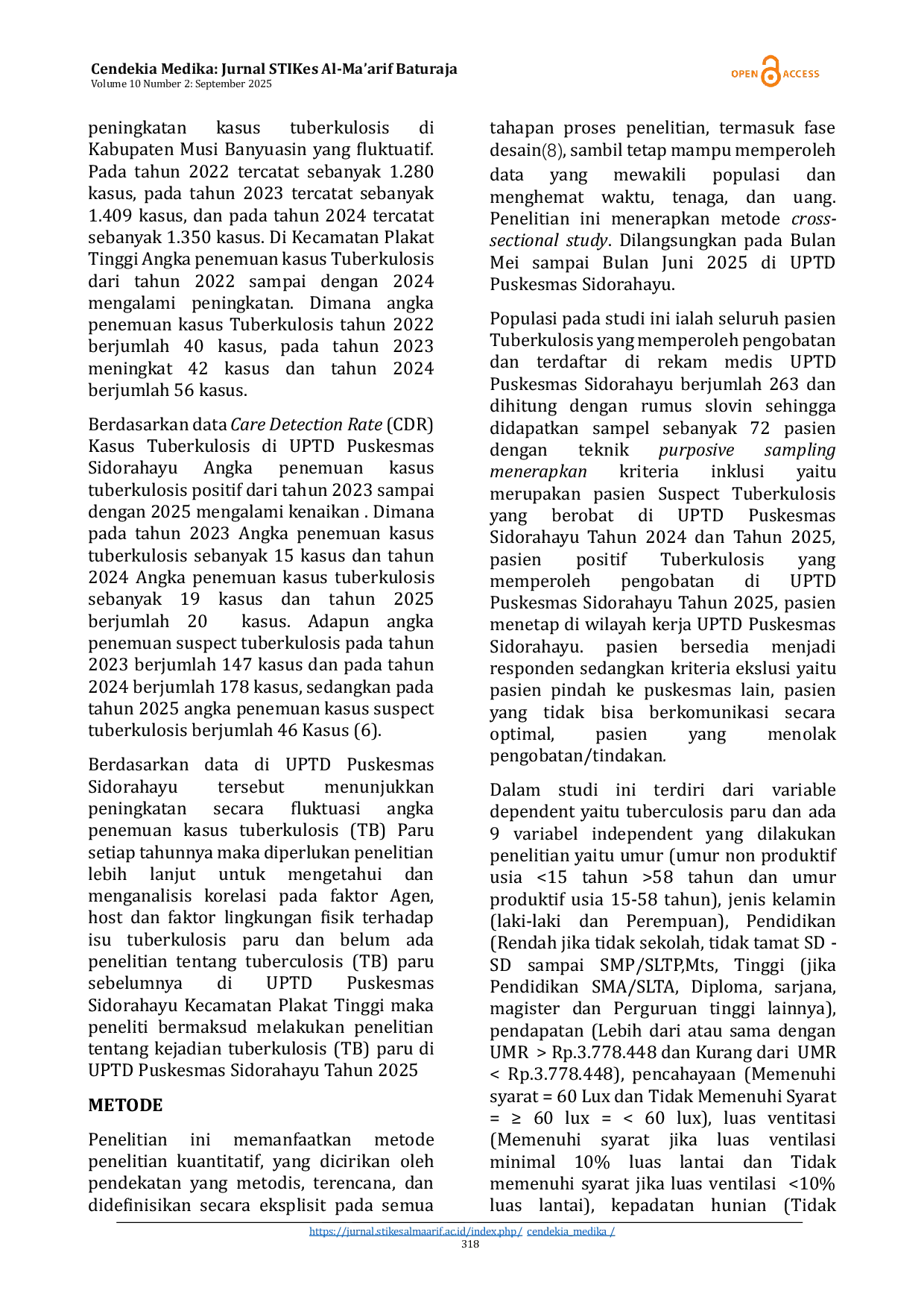Cendekia Medika: Jurnal Stikes Al-Ma`arif BaturajaCendekia Medika: Jurnal Stikes Al-Ma`arif BaturajaMycobacterium tuberculosis, better known as tuberculosis (TB), is an infectious disease that attacks the body system through the lungs. Based on data from the Care Detection Rate (CDR) of Tuberculosis Cases at the UPTD Puskesmas Sidorahayu, the number of positive Tuberculosis cases from 2023 to 2025 has increased. Where in 2023 the number of Tuberculosis cases was 15 cases and in 2024 the number of Tuberculosis cases was 19 cases and in 2025 there were 20 cases. The achievement of the discovery of suspected tuberculosis in 2023 amounted to 147 cases and in 2024 amounted to 178 cases, while in 2025 the number of suspected tuberculosis cases amounted to 46 cases. The purpose of this study was to analyze the picture of the incidence of pulmonary tuberculosis (TB) at the UPTD Puskesmas Sidorahayu in 2025. Research methodology with a Quantitative approach with a cross-sectional study, the research was conducted in May 2025 at UPTD Puskesmas Sidorahayu. The population in this study amounted to 263 which was obtained from positive patients and suspected Tuberculosis patients who received treatment at the Sidorahayu UPTD Puskesmas from 2024-2025, sampling techniques with Purposive sampling using the slovin formula obtained 72 samples, with Univariate, Bivariate, Multivariate data analysis with Chi-Square Test. The results obtained pvalue variable age 0.515, gender 0.206, education 0.328, income 0.792, ventilation 0.025 occupancy density 0.006, humidity 0.004, temperature 0.004, lighting 0.025. In conclusion, there is a significant relationship between ventilation, occupancy density, humidity, temperature, and lighting with the incidence of TB while the variables of age, gender, education, income have no significant relationship with the incidence of TB. The most dominant variable is lighting. UPTD Puskesmas Sidorahayu needs to provide clear and easy-to-understand information to the community about environmental risk factors that can trigger Tuberculosis, such as occupancy density, poor ventilation, poor lighting, and high humidity.