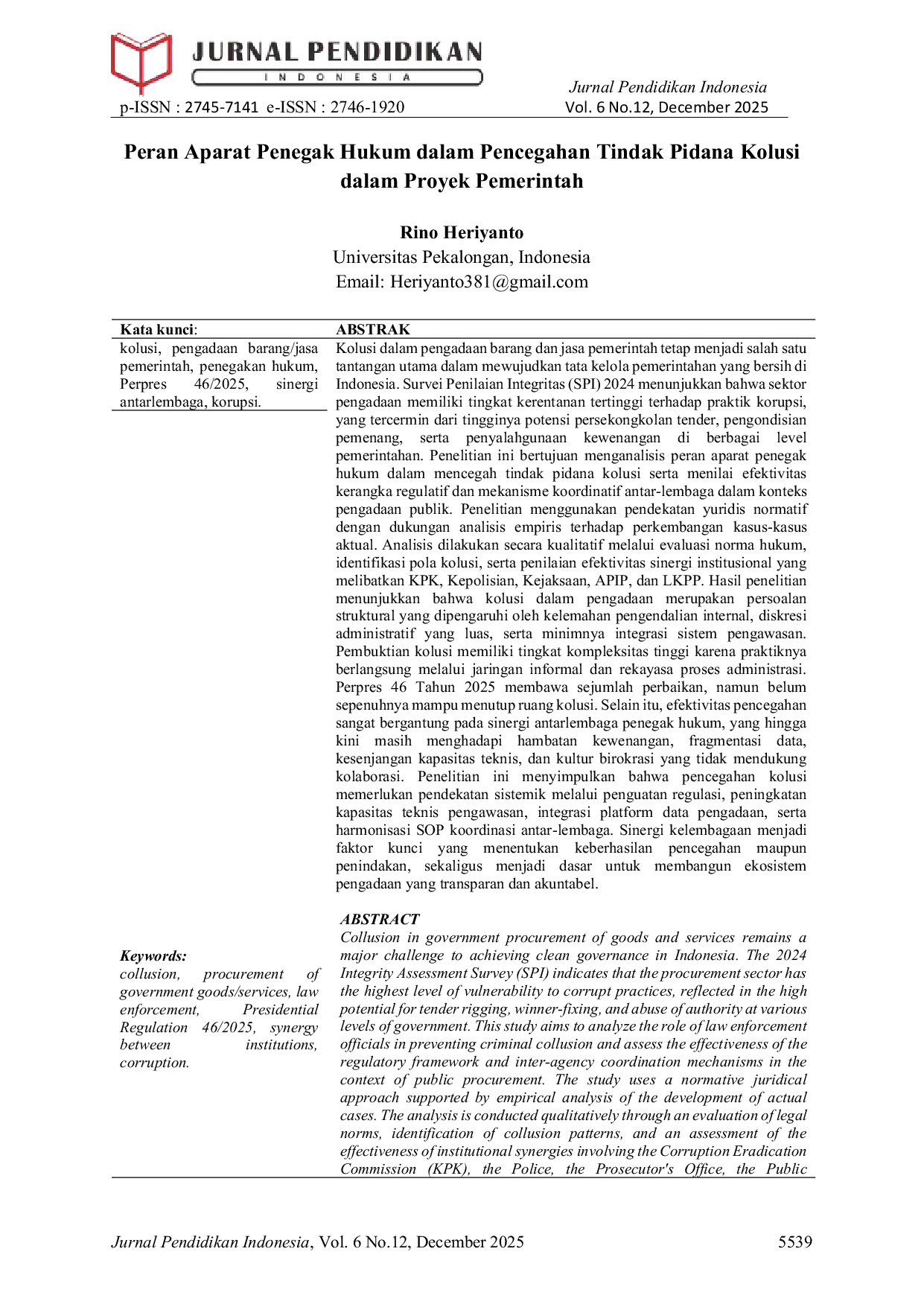 Jurnal Pendidikan IndonesiaJurnal Pendidikan IndonesiaKolusi dalam pengadaan barang dan jasa pemerintah tetap menjadi salah satu tantangan utama dalam mewujudkan tata kelola pemerintahan yang bersih di Indonesia. Survei Penilaian Integritas (SPI) 2024 menunjukkan bahwa sektor pengadaan memiliki tingkat kerentanan tertinggi terhadap praktik korupsi, yang tercermin dari tingginya potensi persekongkolan tender, pengondisian level pemenang, dan penyalahgunaan kewenangan di berbagai tingkat pemerintahan. Penelitian ini bertujuan menganalisis peran aparat penegak hukum dalam mencegah tindak pidana kolusi serta menilai efektivitas kerangka regulatif dan mekanisme koordinatif antar-lembaga dalam konteks pengadaan publik.